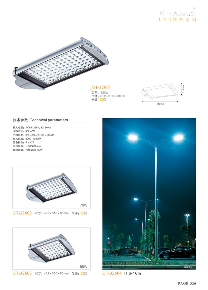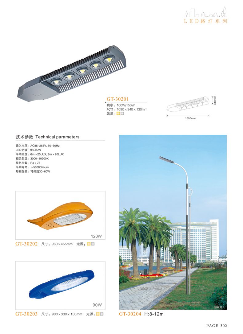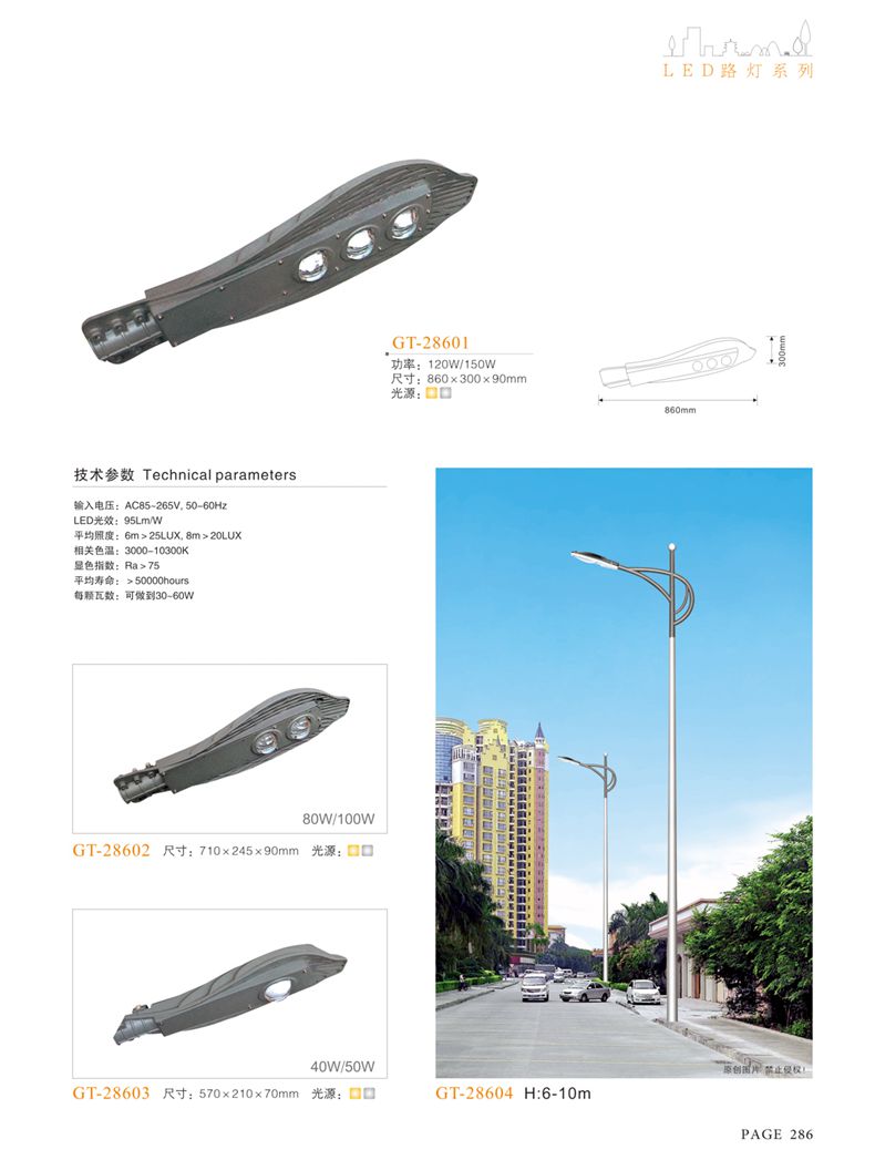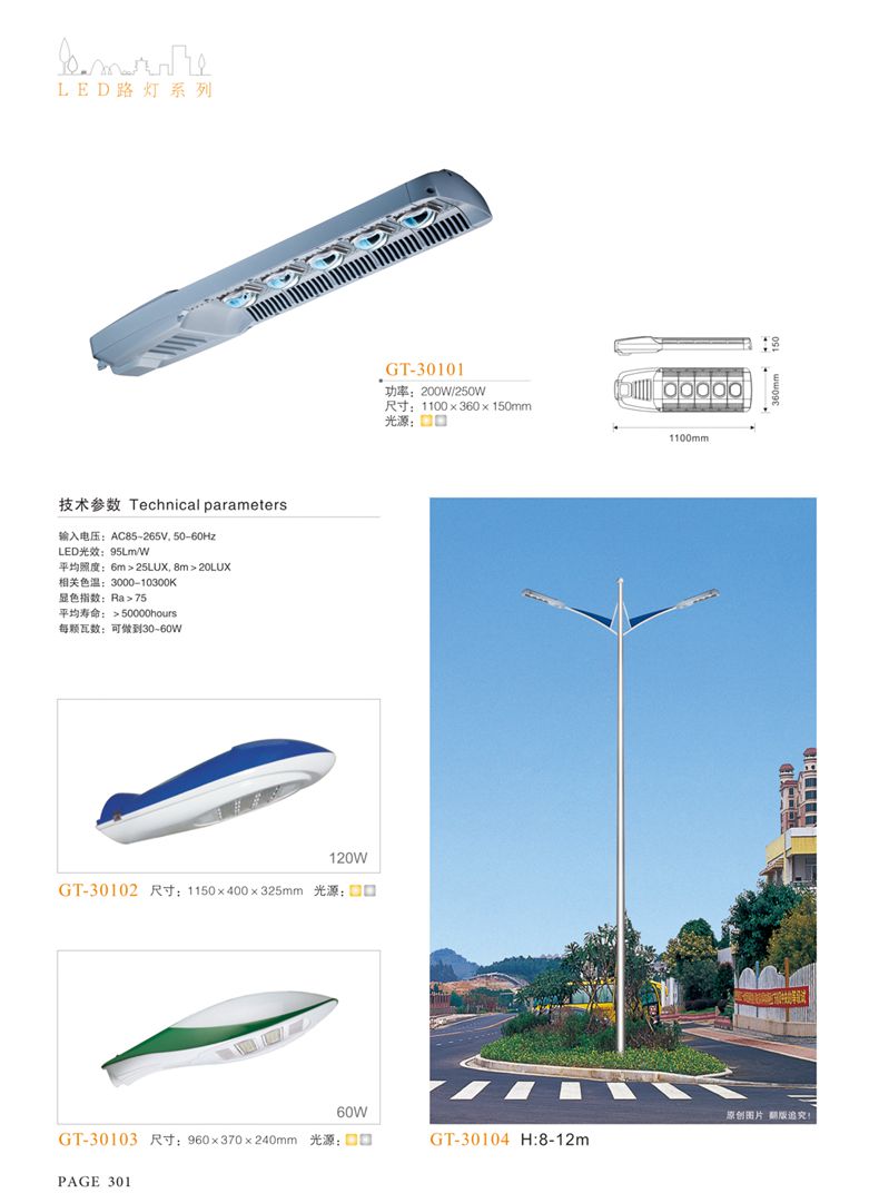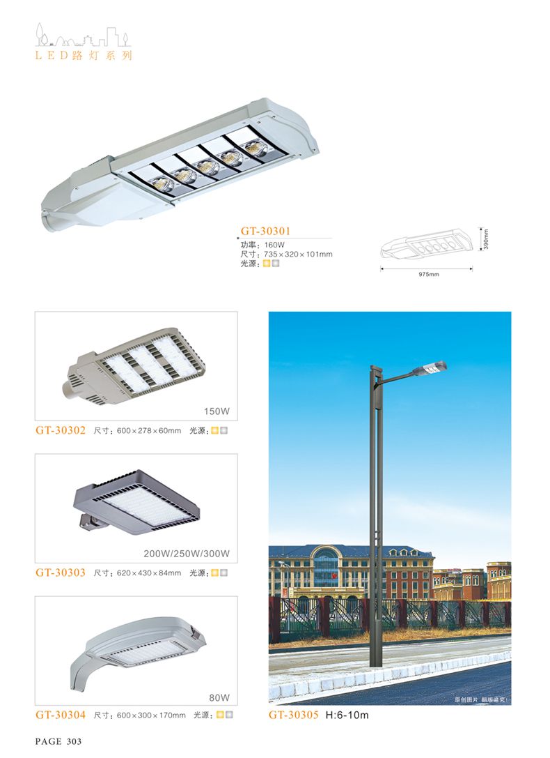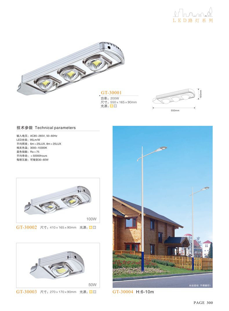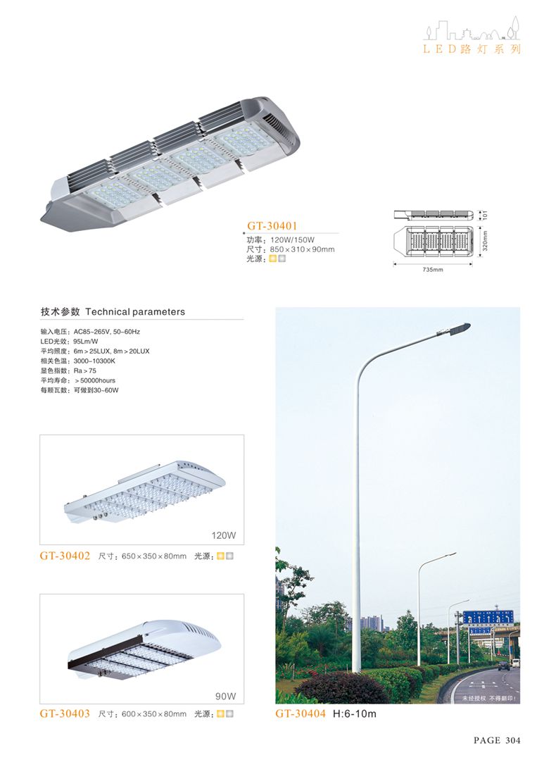 產(chǎn)品名稱:LED道路燈 配用光源:LED30-300W 高壓鈉燈150W、250W、400W 電源參數(shù):220V±10V/50Hz-60Hz 燈具燈頭:壓鑄鋁制品燈具,E40陶瓷燈頭 安裝高度:6米~12米 材料參數(shù):鐵制品內(nèi)外熱鍍鋅防腐處理,燈體表面噴優(yōu)質(zhì)戶外氟碳漆 產(chǎn)品特點(diǎn):設(shè)計美觀、簡潔大方、安裝方便 使用場所:高速公路、城市道路、廠區(qū)、別墅等場所