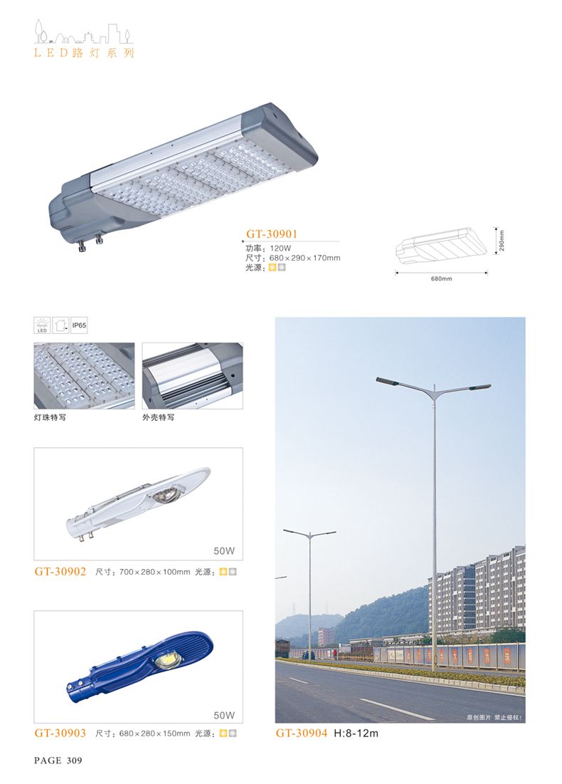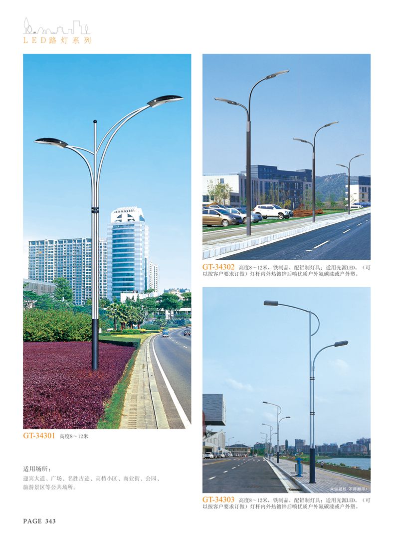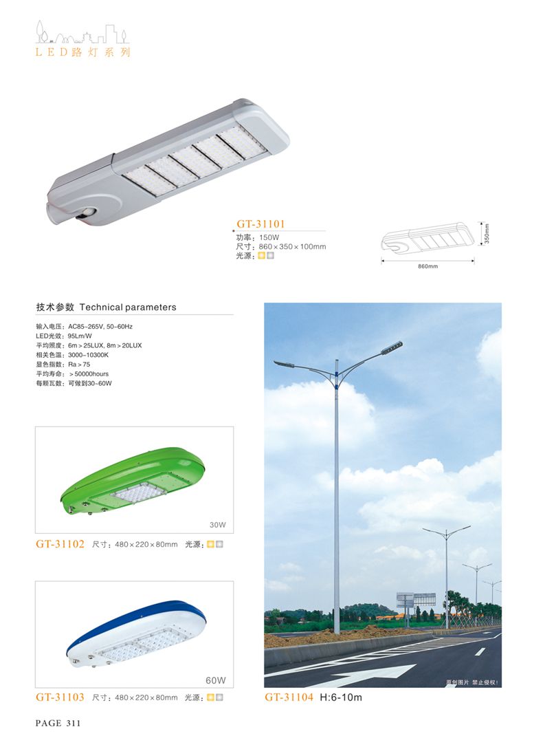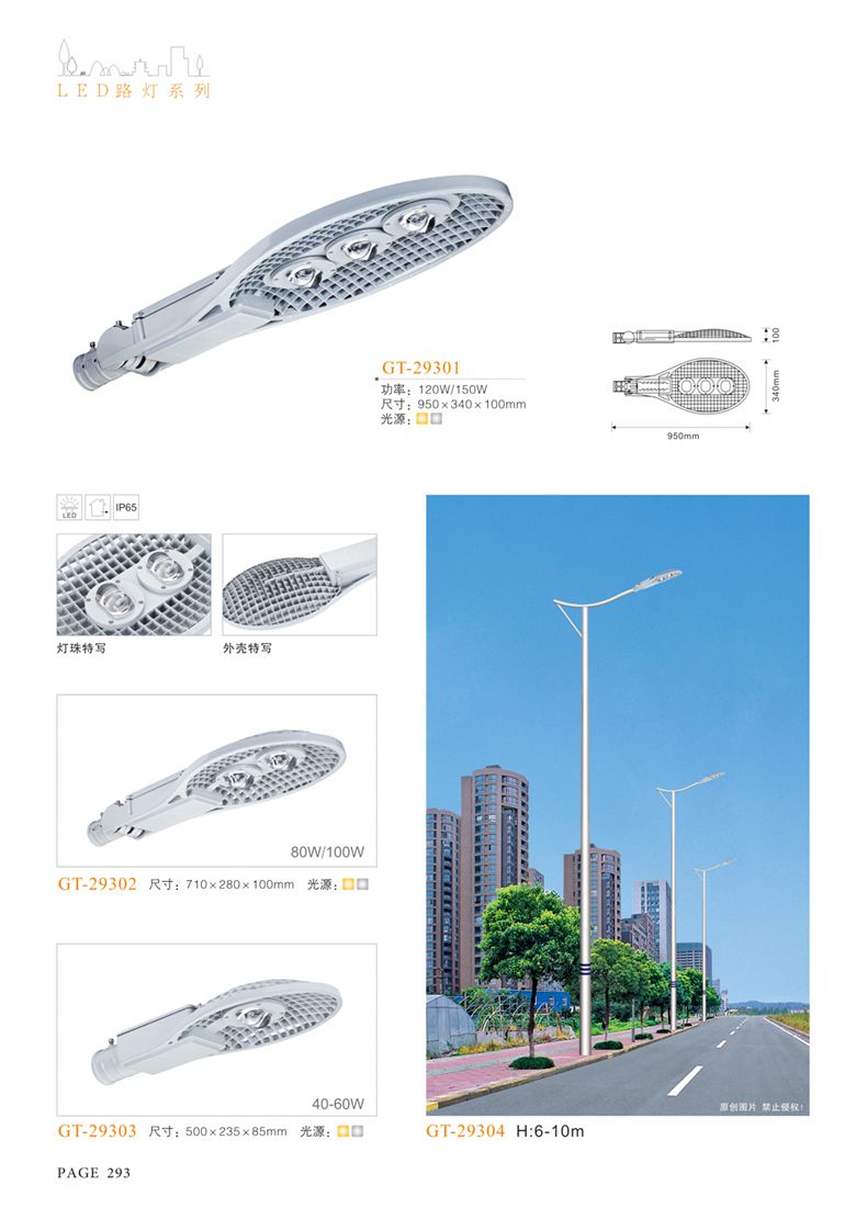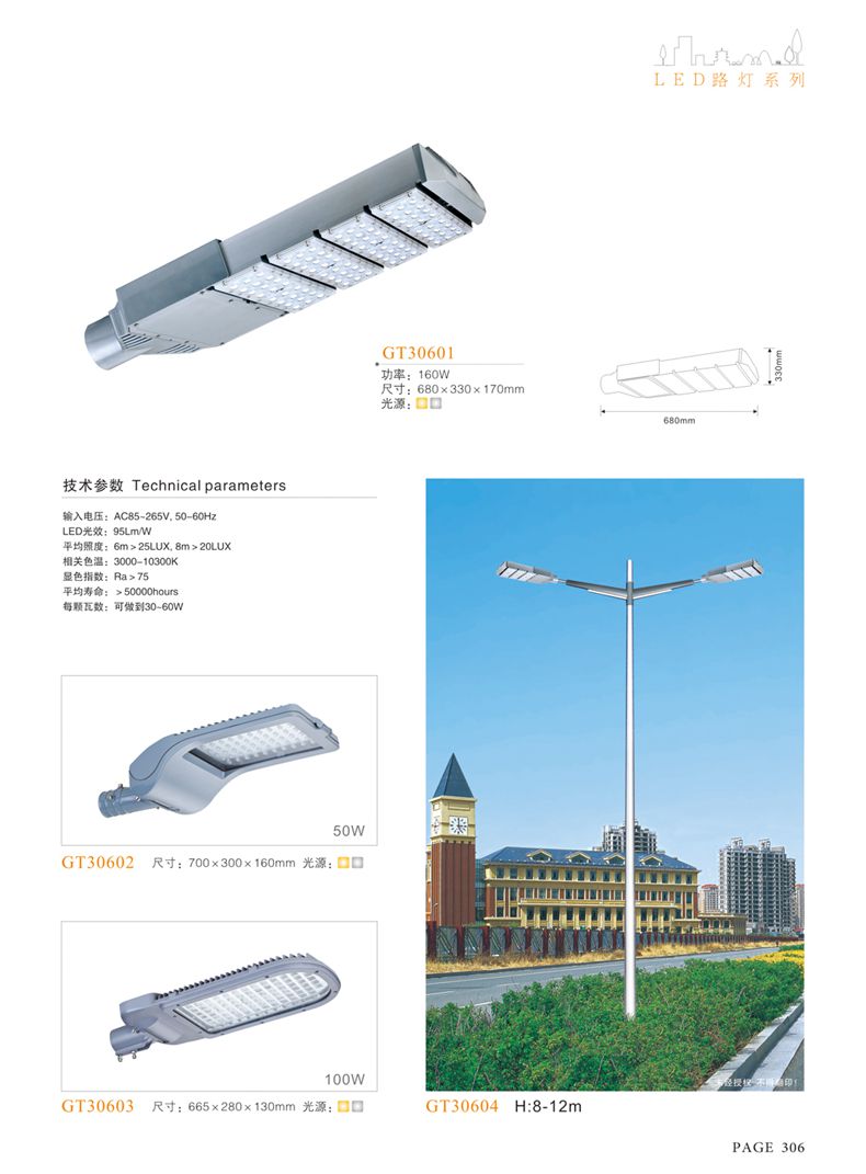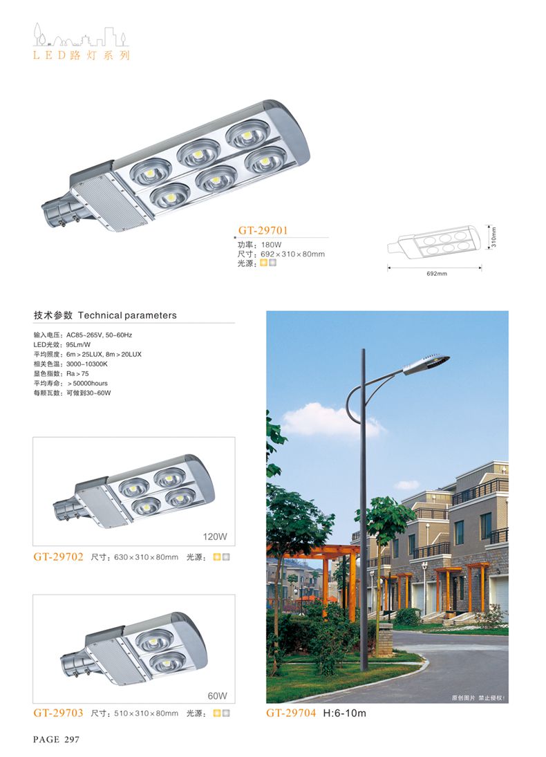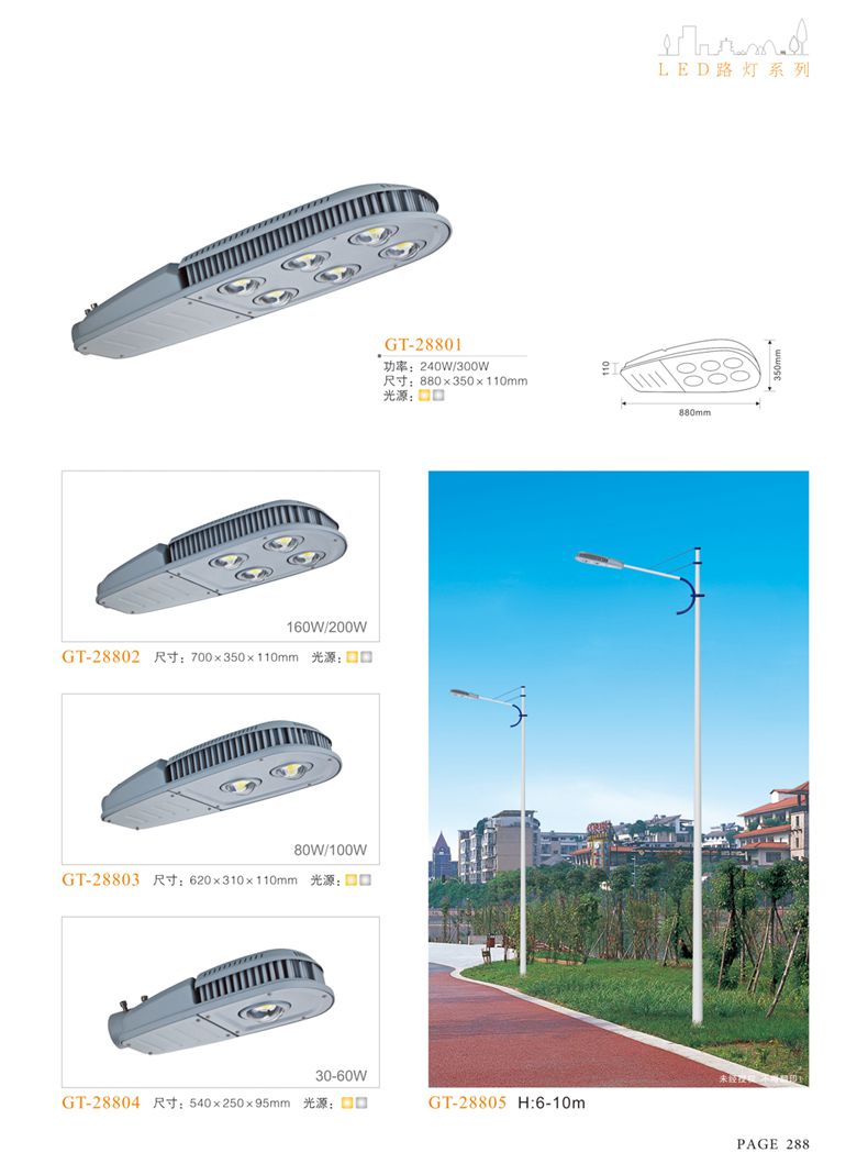 產(chǎn)品名稱:LED道路燈 配用光源:LED30-300W 高壓鈉燈150W、250W、400W 電源參數(shù):220V±10V/50Hz-60Hz 燈具燈頭:壓鑄鋁制品燈具,E40陶瓷燈頭 安裝高度:6米~12米 材料參數(shù):鐵制品內(nèi)外熱鍍鋅防腐處理,燈體表面噴優(yōu)質(zhì)戶外氟碳漆 產(chǎn)品特點(diǎn):設(shè)計美觀、簡潔大方、安裝方便 使用場所:高速公路、城市道路、廠區(qū)、別墅等場所