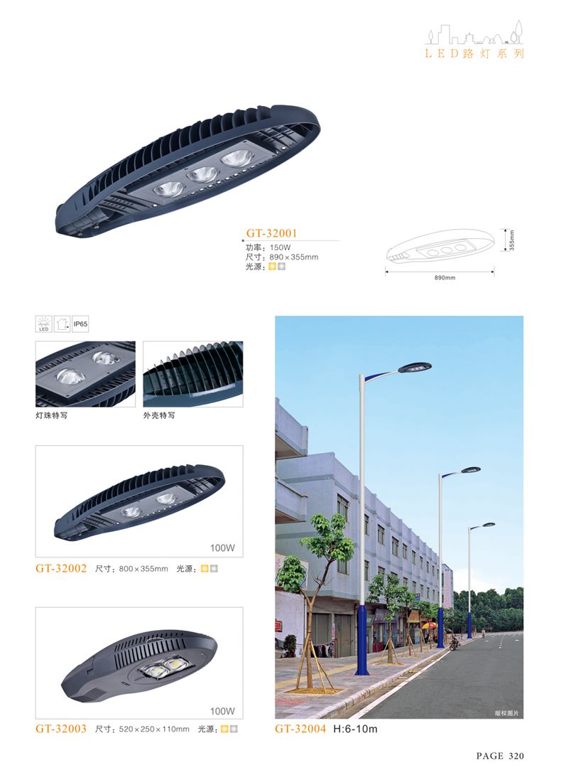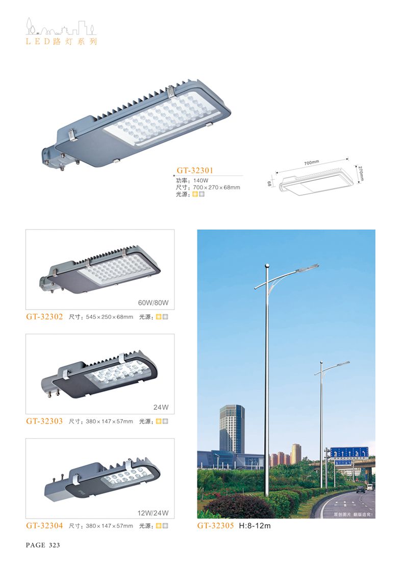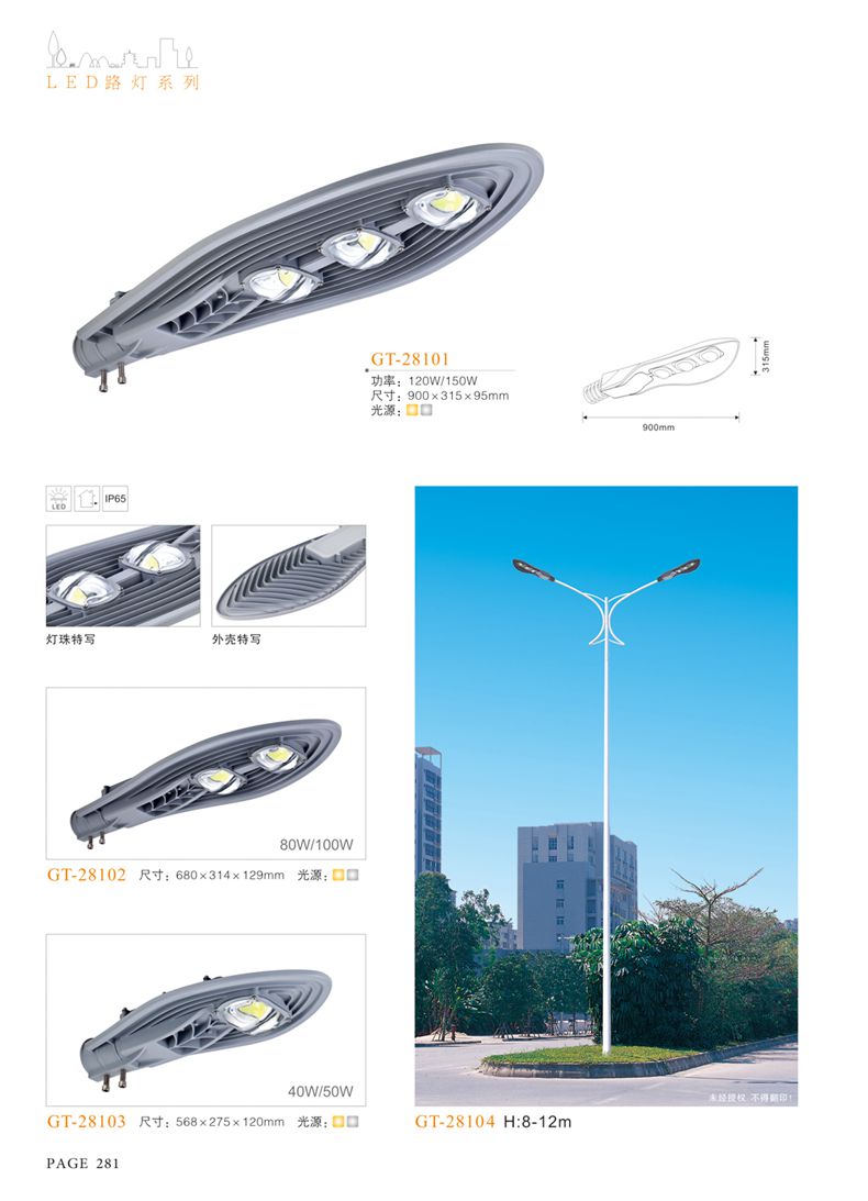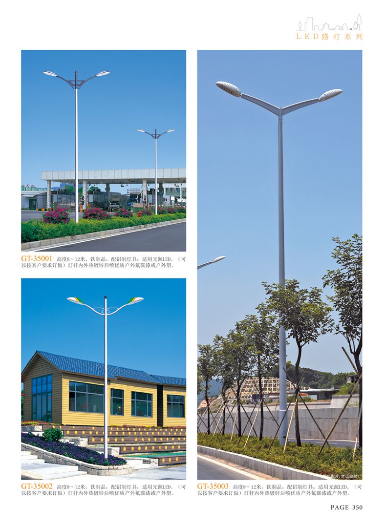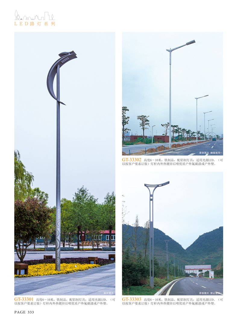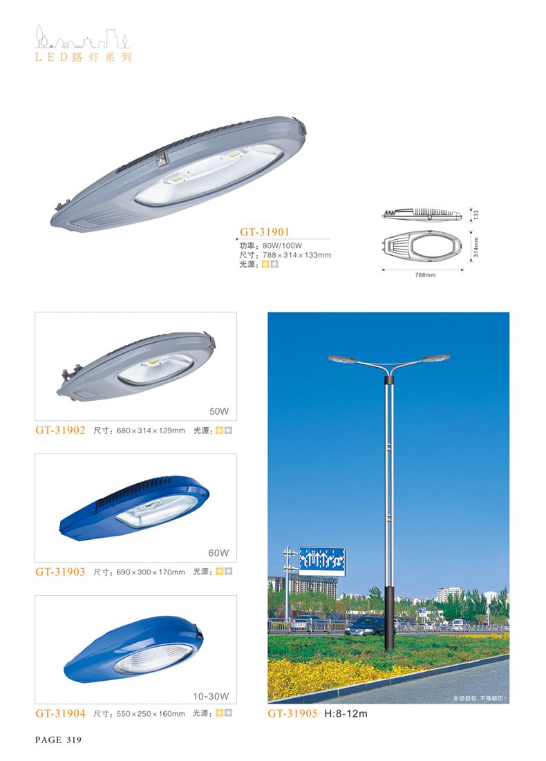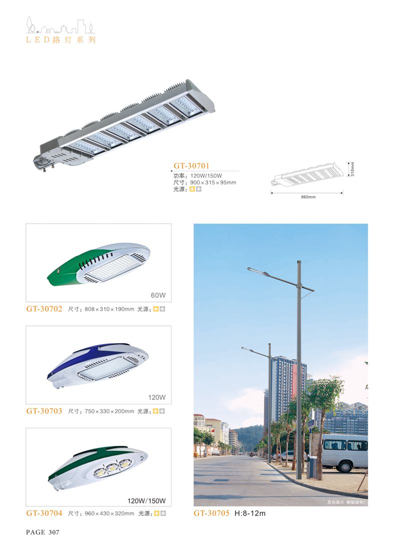 產(chǎn)品名稱:LED道路燈 配用光源:LED30-300W 高壓鈉燈150W、250W、400W 電源參數(shù):220V±10V/50Hz-60Hz 燈具燈頭:壓鑄鋁制品燈具,E40陶瓷燈頭 安裝高度:6米~12米 材料參數(shù):鐵制品內(nèi)外熱鍍鋅防腐處理,燈體表面噴優(yōu)質(zhì)戶外氟碳漆 產(chǎn)品特點(diǎn):設(shè)計美觀、簡潔大方、安裝方便 使用場所:高速公路、城市道路、廠區(qū)、別墅等場所