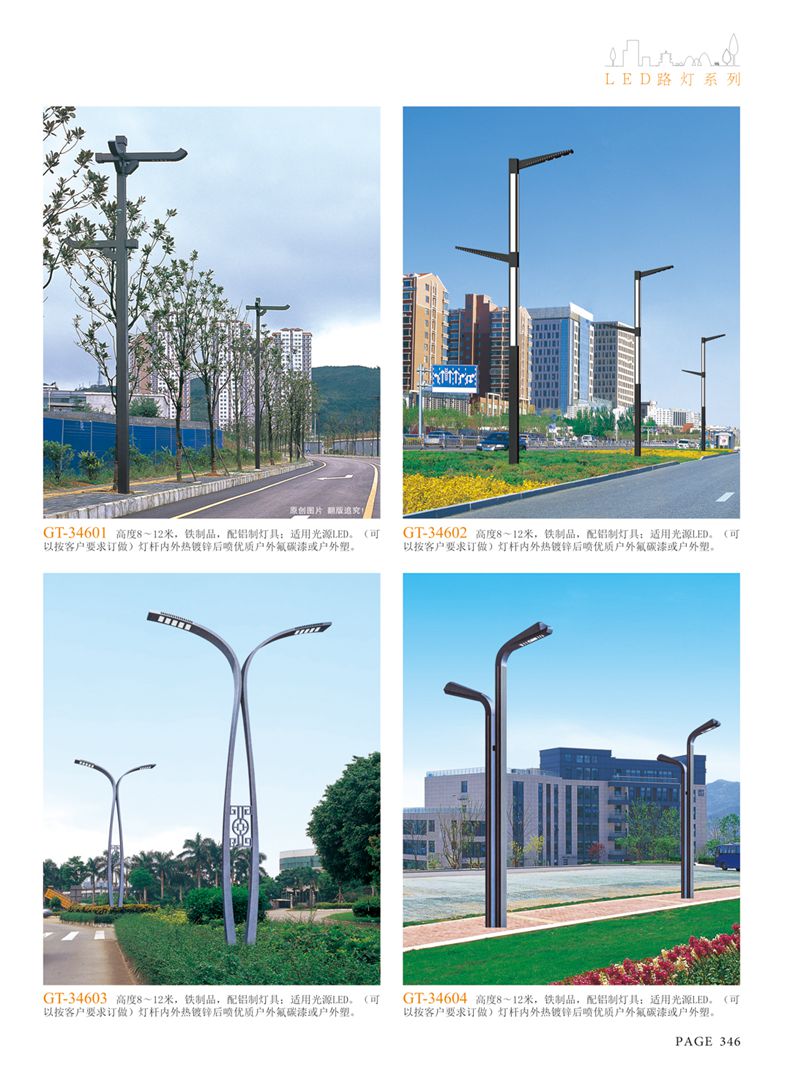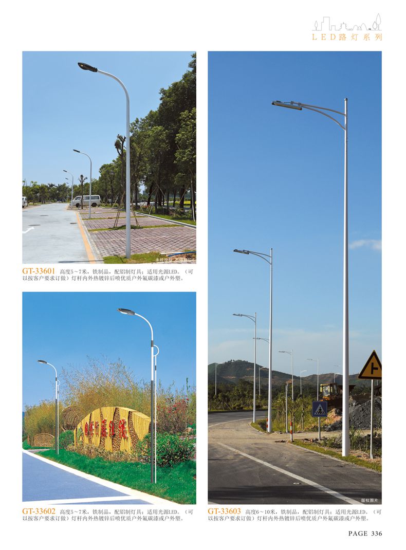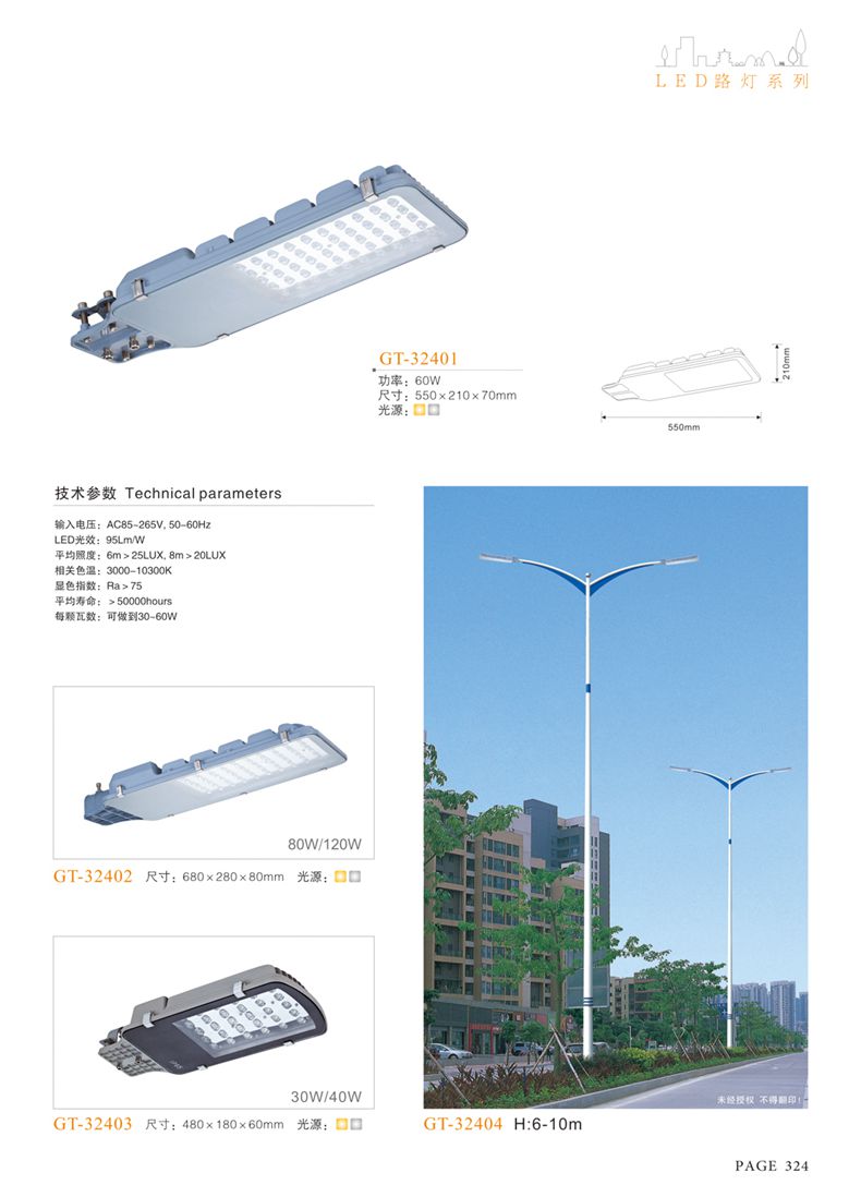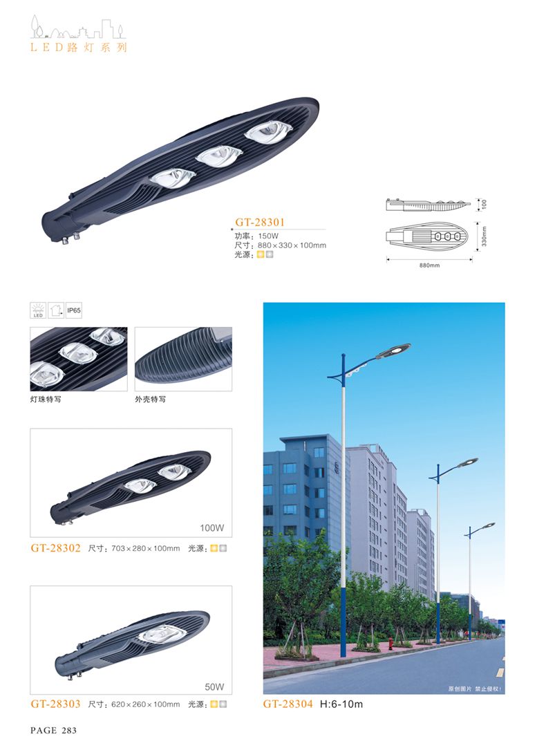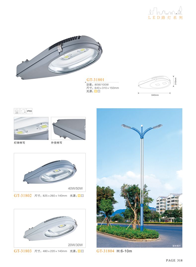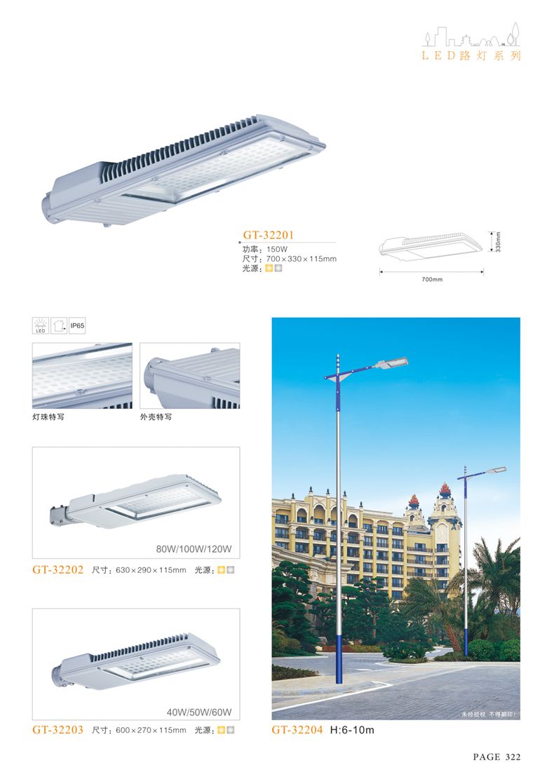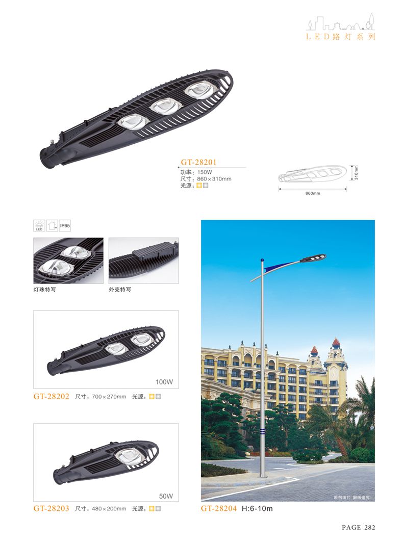 產(chǎn)品名稱:LED道路燈 配用光源:LED30-300W 高壓鈉燈150W、250W、400W 電源參數(shù):220V±10V/50Hz-60Hz 燈具燈頭:壓鑄鋁制品燈具,E40陶瓷燈頭 安裝高度:6米~12米 材料參數(shù):鐵制品內(nèi)外熱鍍鋅防腐處理,燈體表面噴優(yōu)質(zhì)戶外氟碳漆 產(chǎn)品特點(diǎn):設(shè)計美觀、簡潔大方、安裝方便 使用場所:高速公路、城市道路、廠區(qū)、別墅等場所