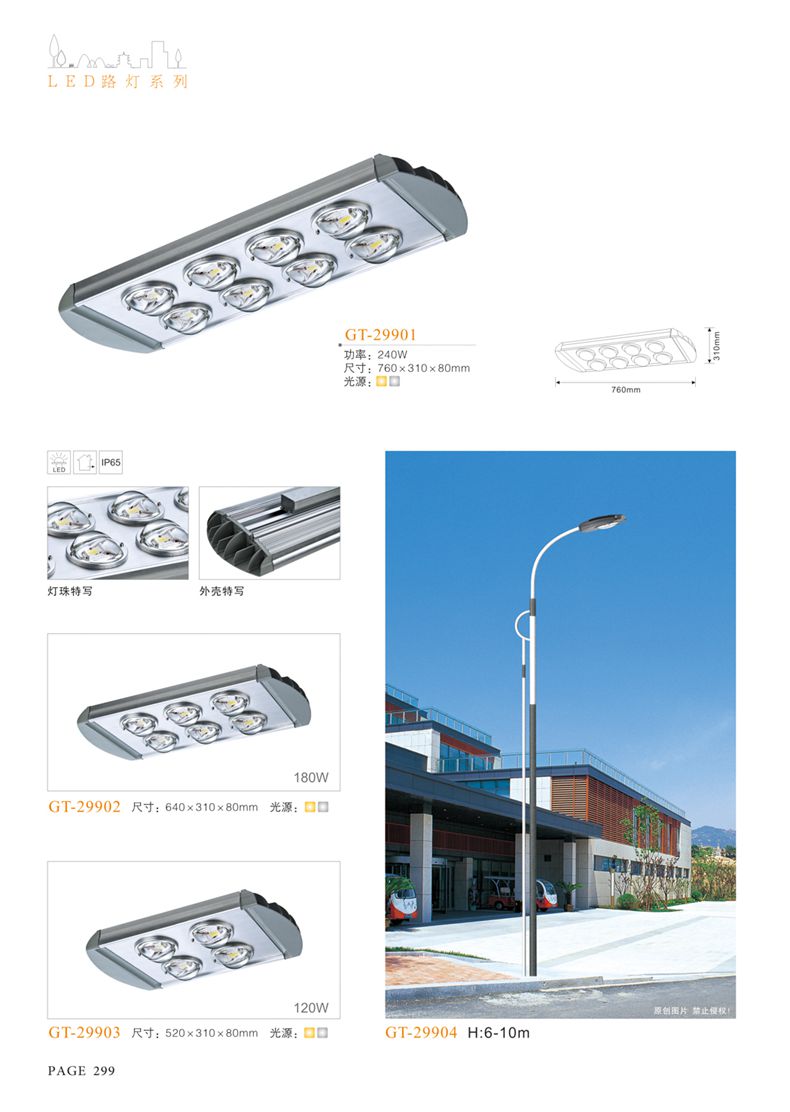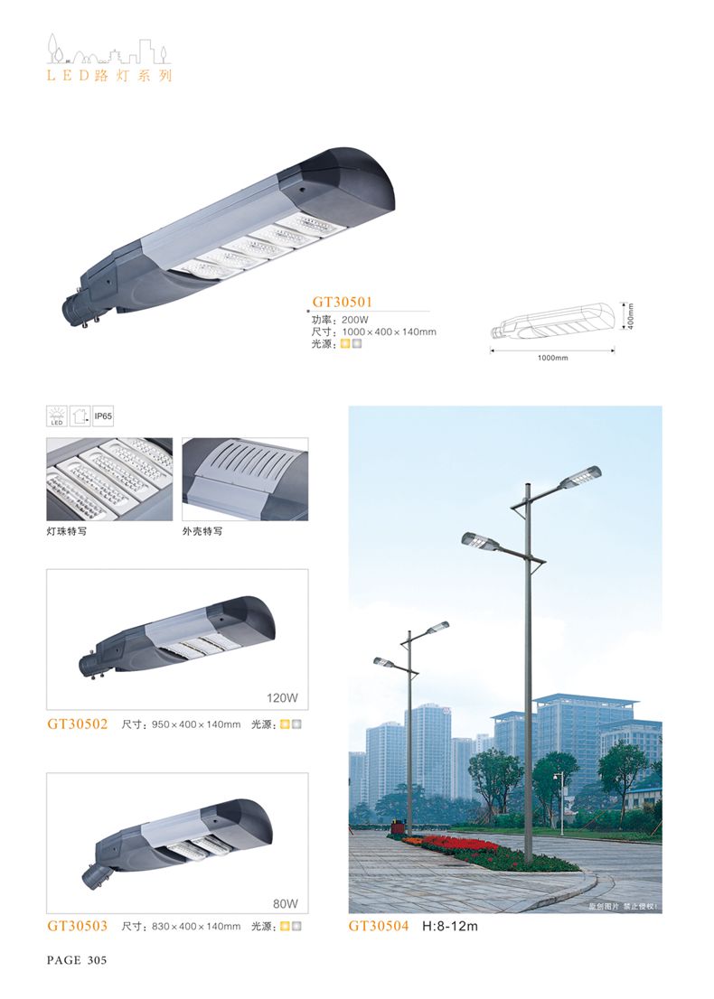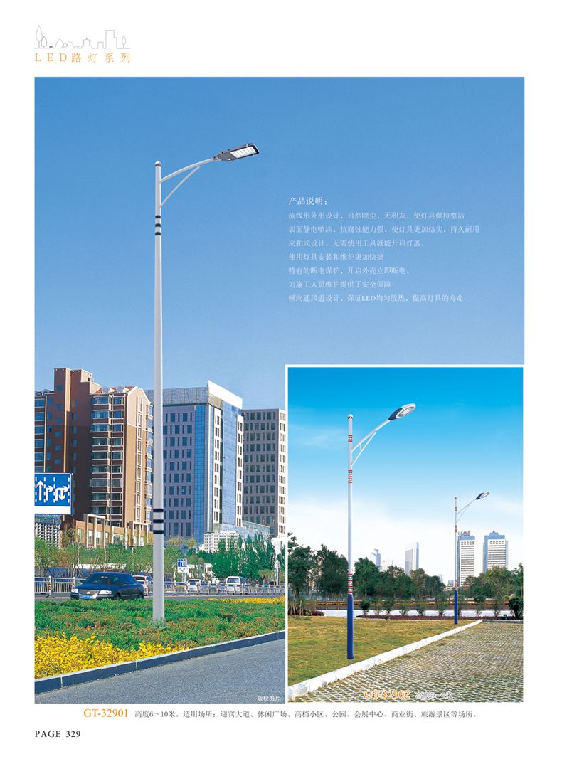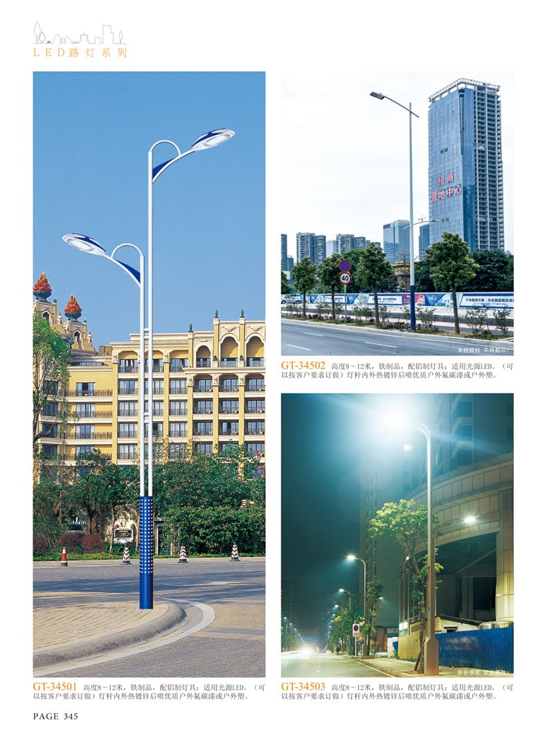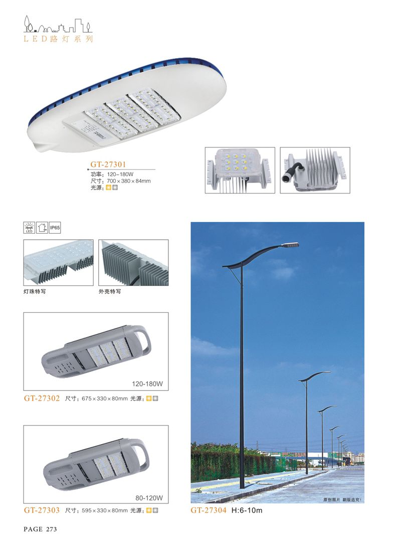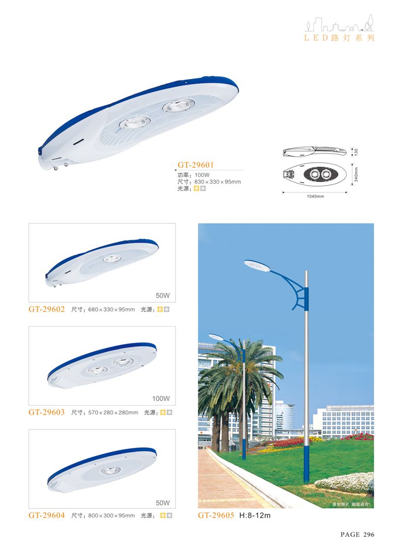 產(chǎn)品名稱:LED道路燈 配用光源:LED30-300W 高壓鈉燈150W、250W、400W 電源參數(shù):220V±10V/50Hz-60Hz 燈具燈頭:壓鑄鋁制品燈具,E40陶瓷燈頭 安裝高度:6米~12米 材料參數(shù):鐵制品內(nèi)外熱鍍鋅防腐處理,燈體表面噴優(yōu)質(zhì)戶外氟碳漆 產(chǎn)品特點(diǎn):設(shè)計美觀、簡潔大方、安裝方便 使用場所:高速公路、城市道路、廠區(qū)、別墅等場所