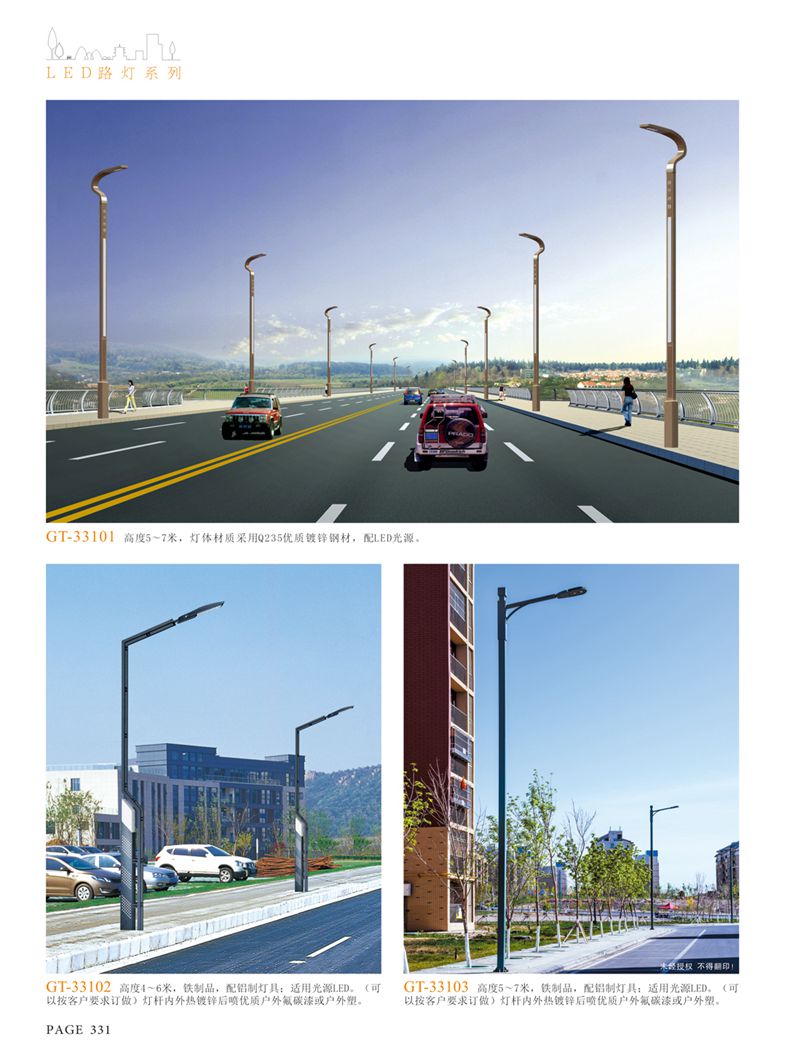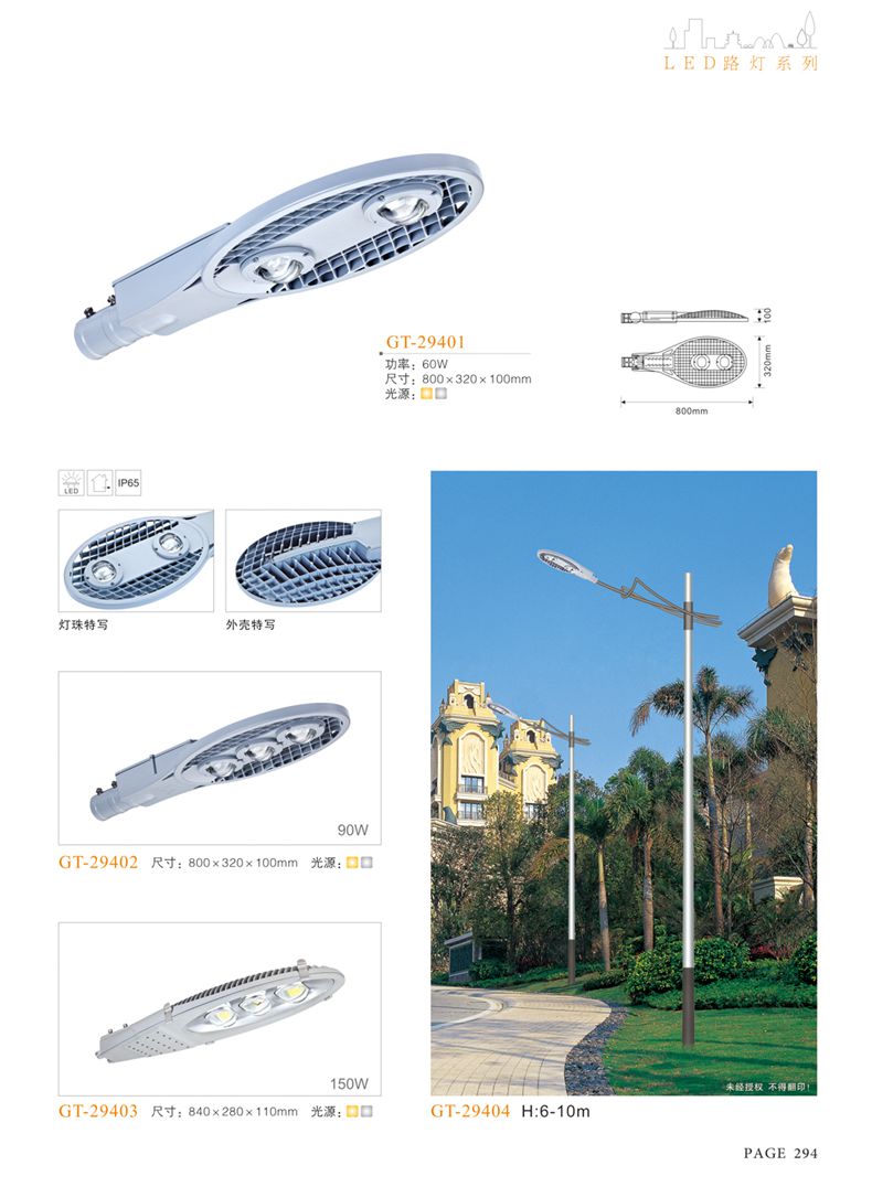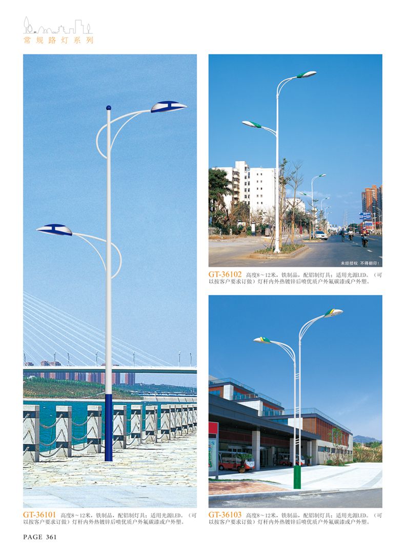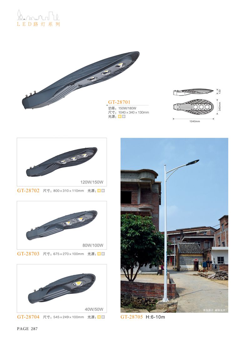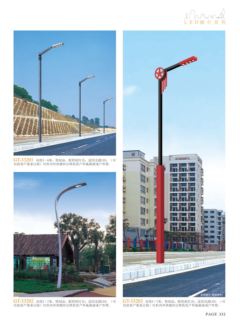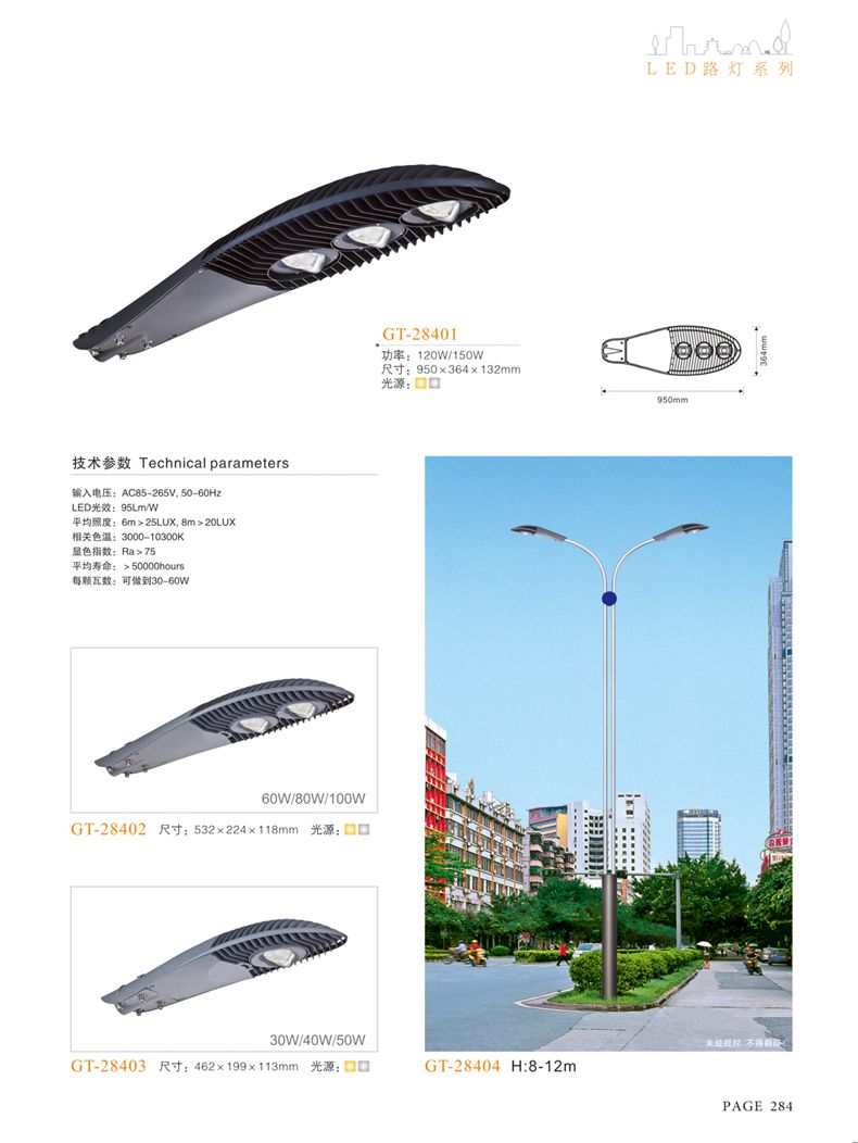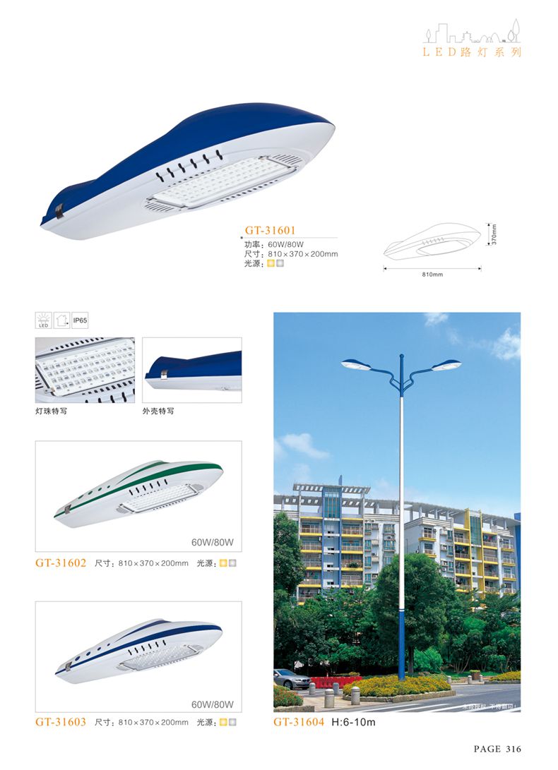 產(chǎn)品名稱:LED道路燈 配用光源:LED30-300W 高壓鈉燈150W、250W、400W 電源參數(shù):220V±10V/50Hz-60Hz 燈具燈頭:壓鑄鋁制品燈具,E40陶瓷燈頭 安裝高度:6米~12米 材料參數(shù):鐵制品內(nèi)外熱鍍鋅防腐處理,燈體表面噴優(yōu)質(zhì)戶外氟碳漆 產(chǎn)品特點(diǎn):設(shè)計美觀、簡潔大方、安裝方便 使用場所:高速公路、城市道路、廠區(qū)、別墅等場所