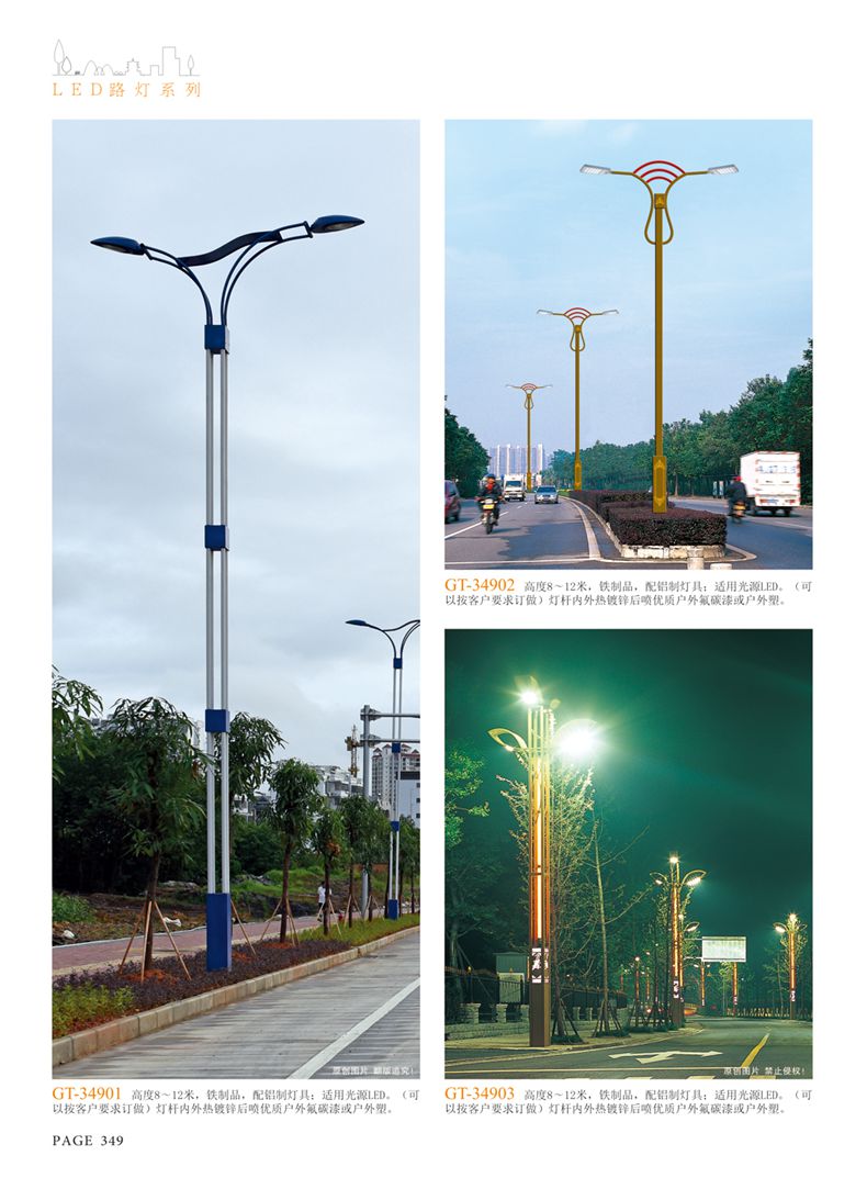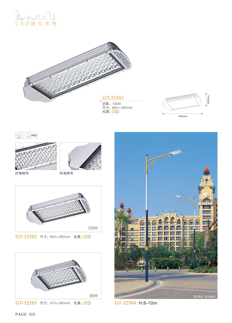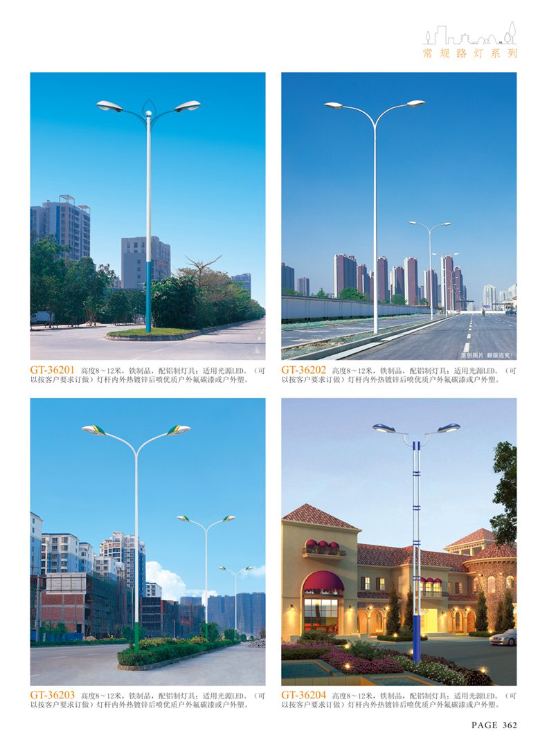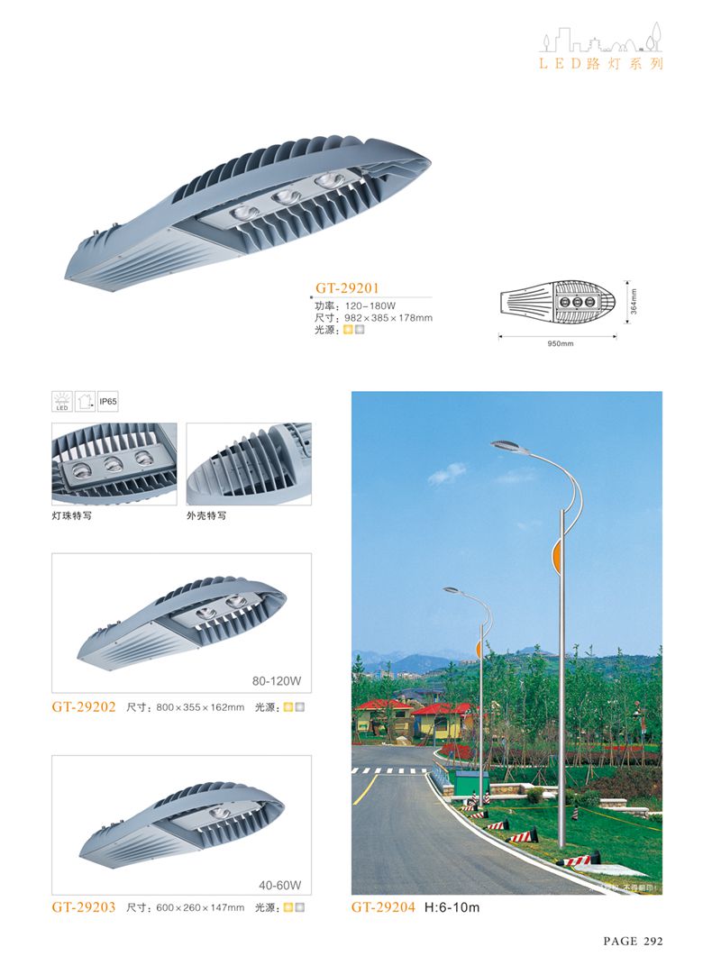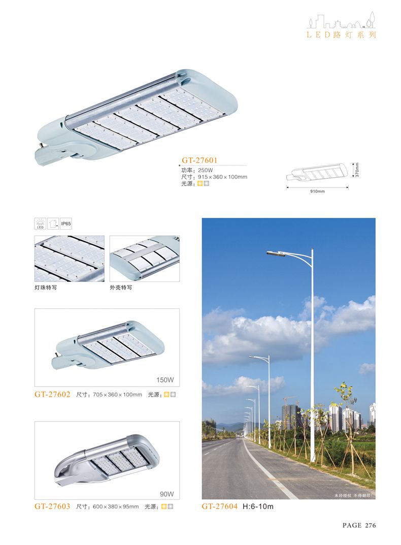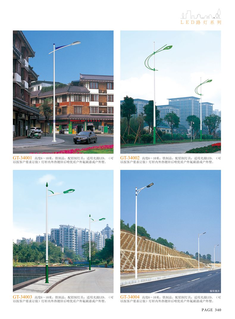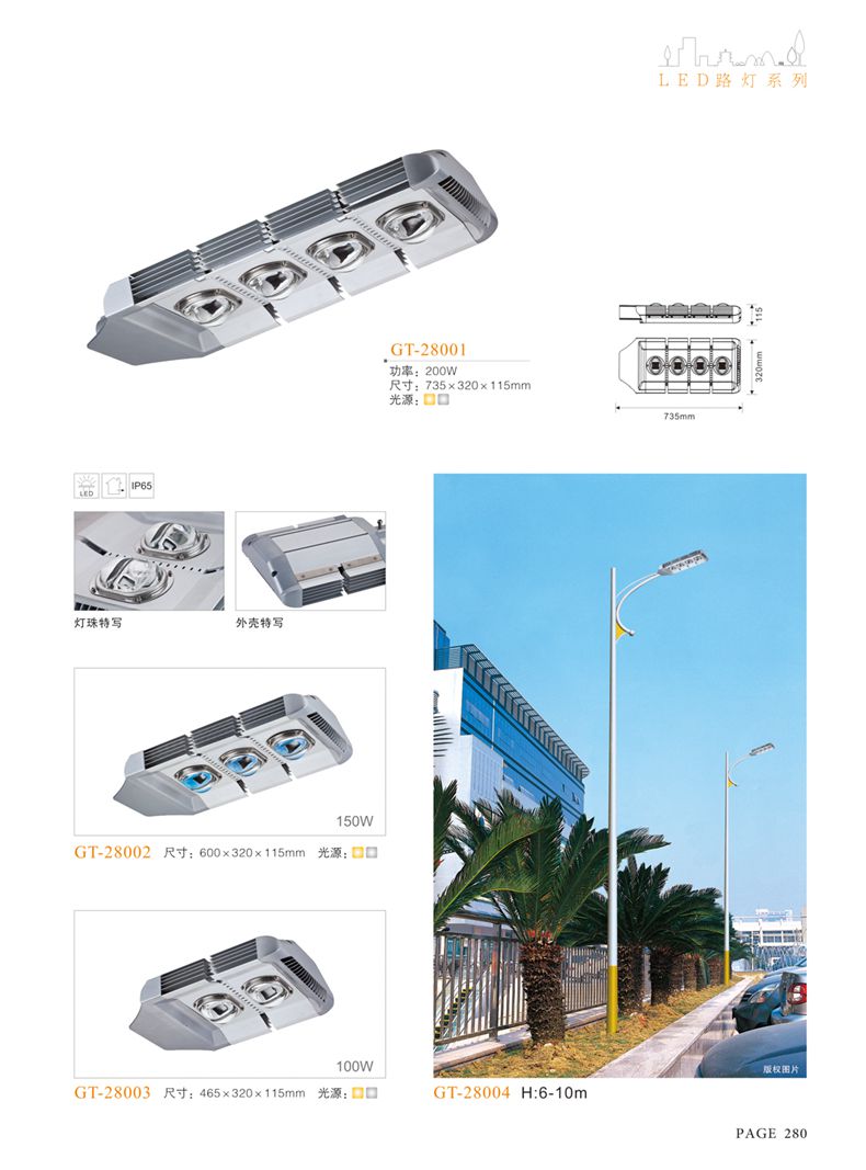 產(chǎn)品名稱:LED道路燈 配用光源:LED30-300W 高壓鈉燈150W、250W、400W 電源參數(shù):220V±10V/50Hz-60Hz 燈具燈頭:壓鑄鋁制品燈具,E40陶瓷燈頭 安裝高度:6米~12米 材料參數(shù):鐵制品內(nèi)外熱鍍鋅防腐處理,燈體表面噴優(yōu)質(zhì)戶外氟碳漆 產(chǎn)品特點(diǎn):設(shè)計美觀、簡潔大方、安裝方便 使用場所:高速公路、城市道路、廠區(qū)、別墅等場所