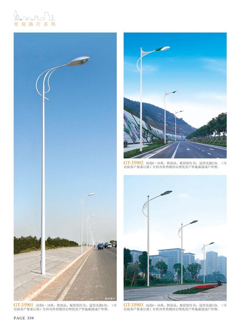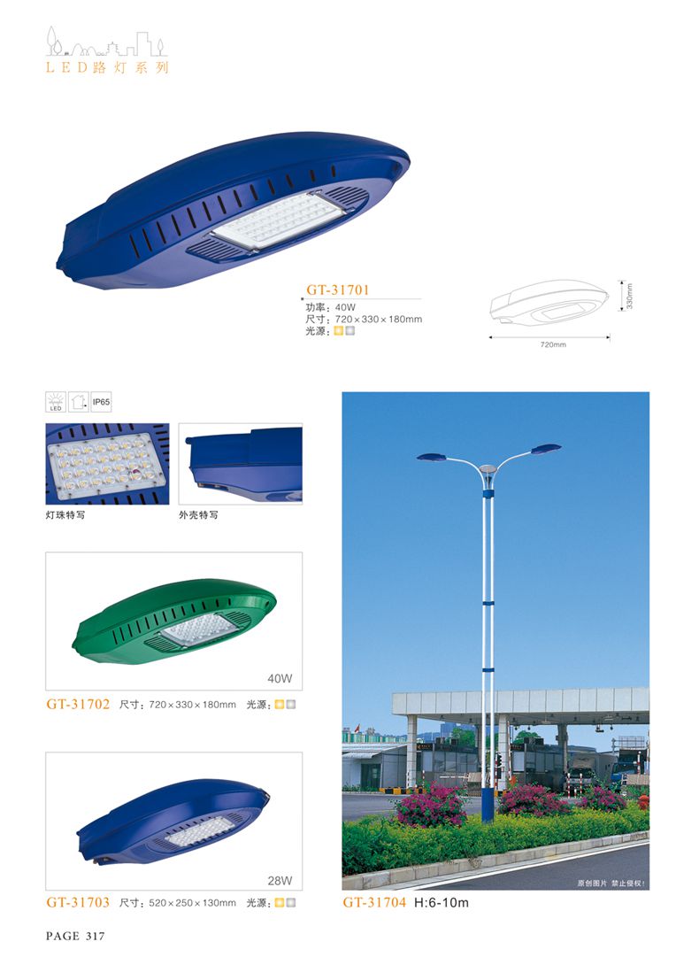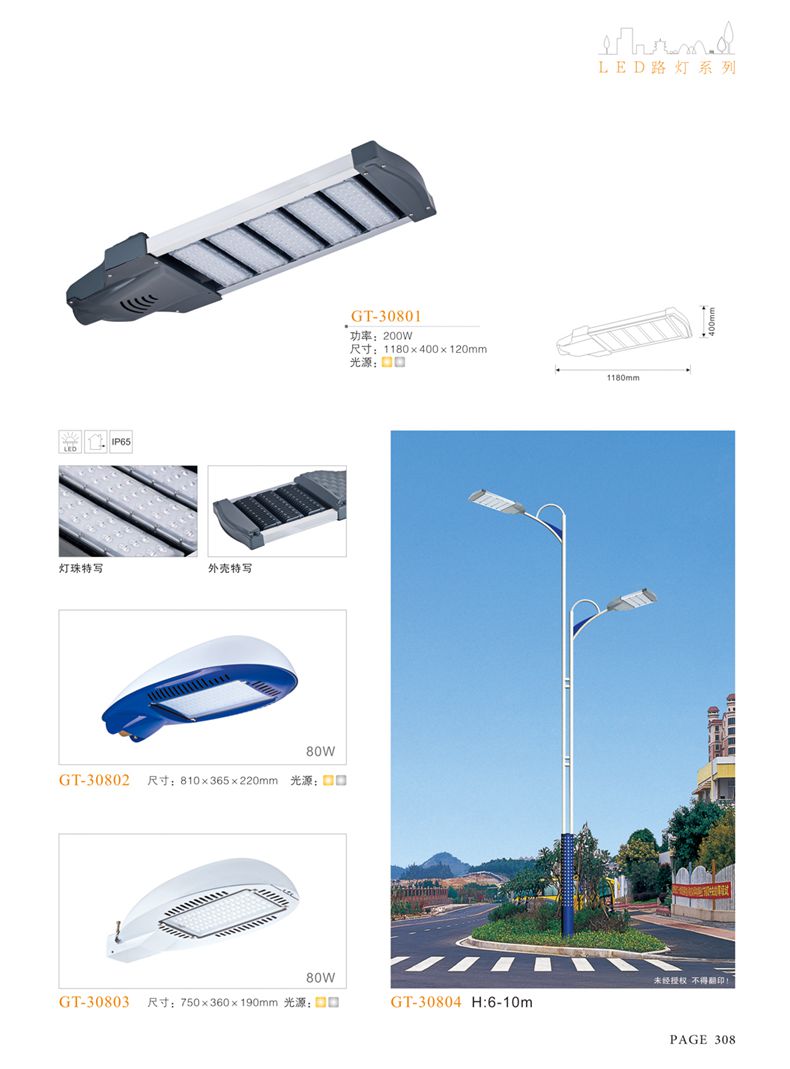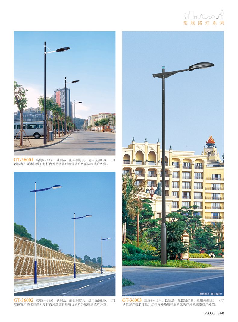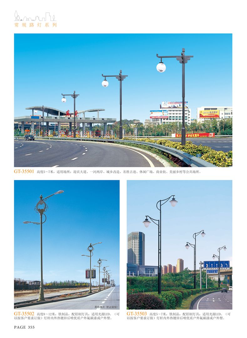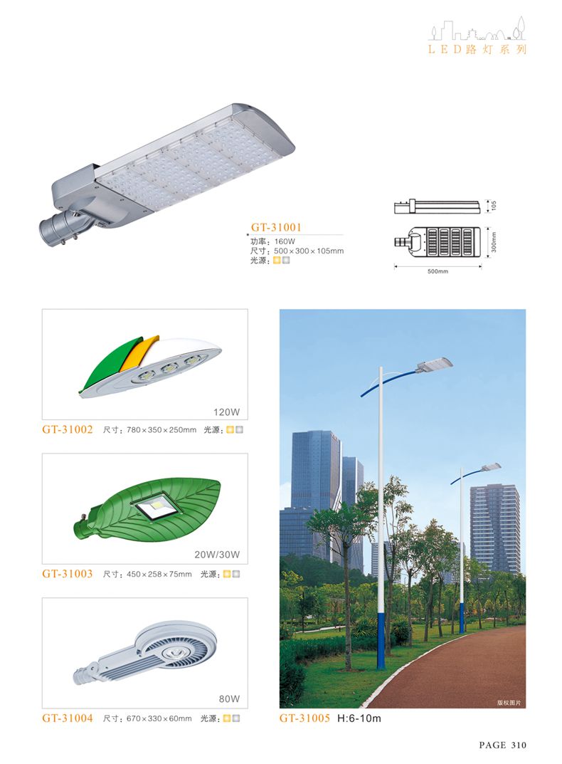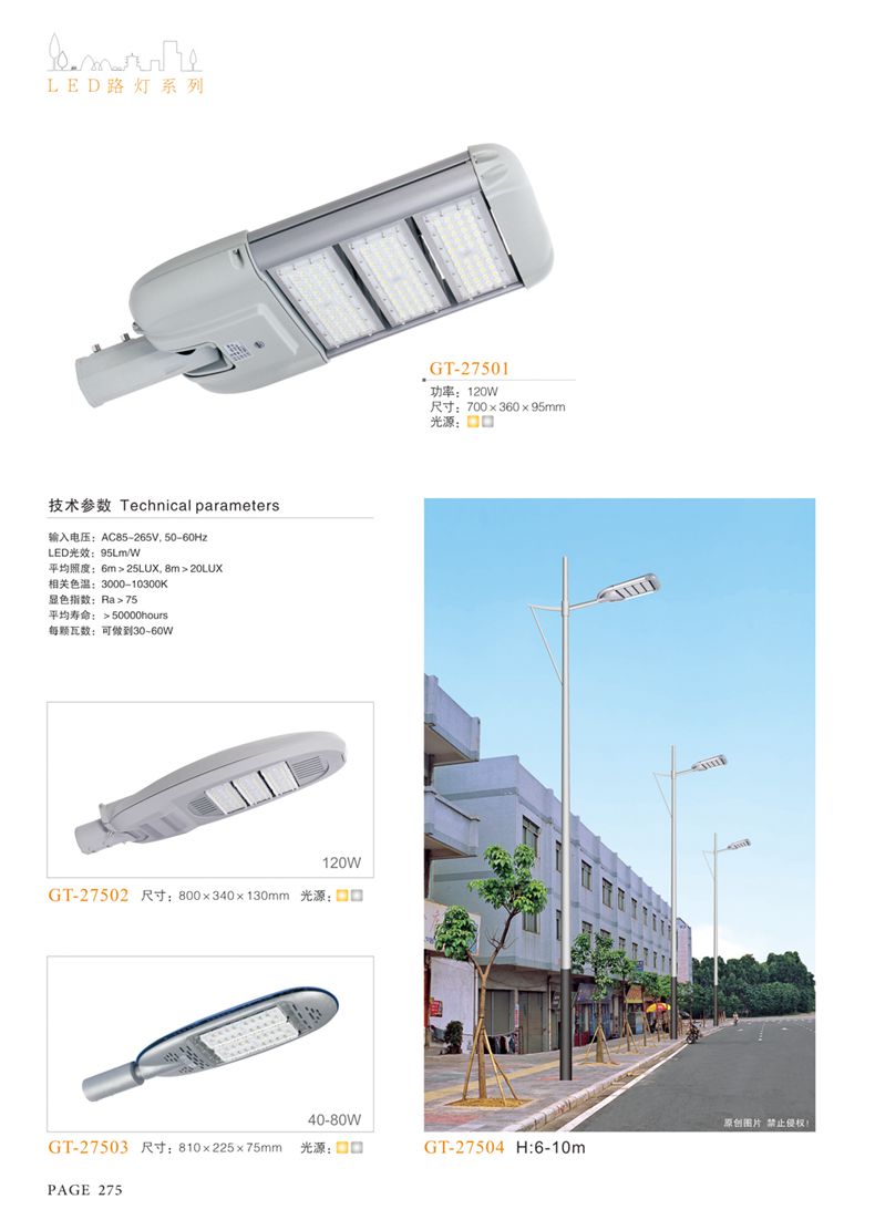 產(chǎn)品名稱:LED道路燈 配用光源:LED30-300W 高壓鈉燈150W、250W、400W 電源參數(shù):220V±10V/50Hz-60Hz 燈具燈頭:壓鑄鋁制品燈具,E40陶瓷燈頭 安裝高度:6米~12米 材料參數(shù):鐵制品內(nèi)外熱鍍鋅防腐處理,燈體表面噴優(yōu)質(zhì)戶外氟碳漆 產(chǎn)品特點(diǎn):設(shè)計美觀、簡潔大方、安裝方便 使用場所:高速公路、城市道路、廠區(qū)、別墅等場所
