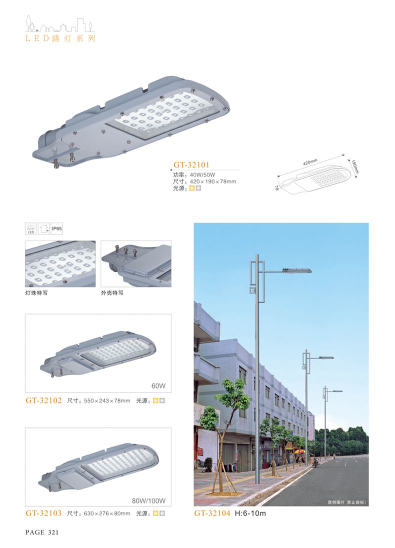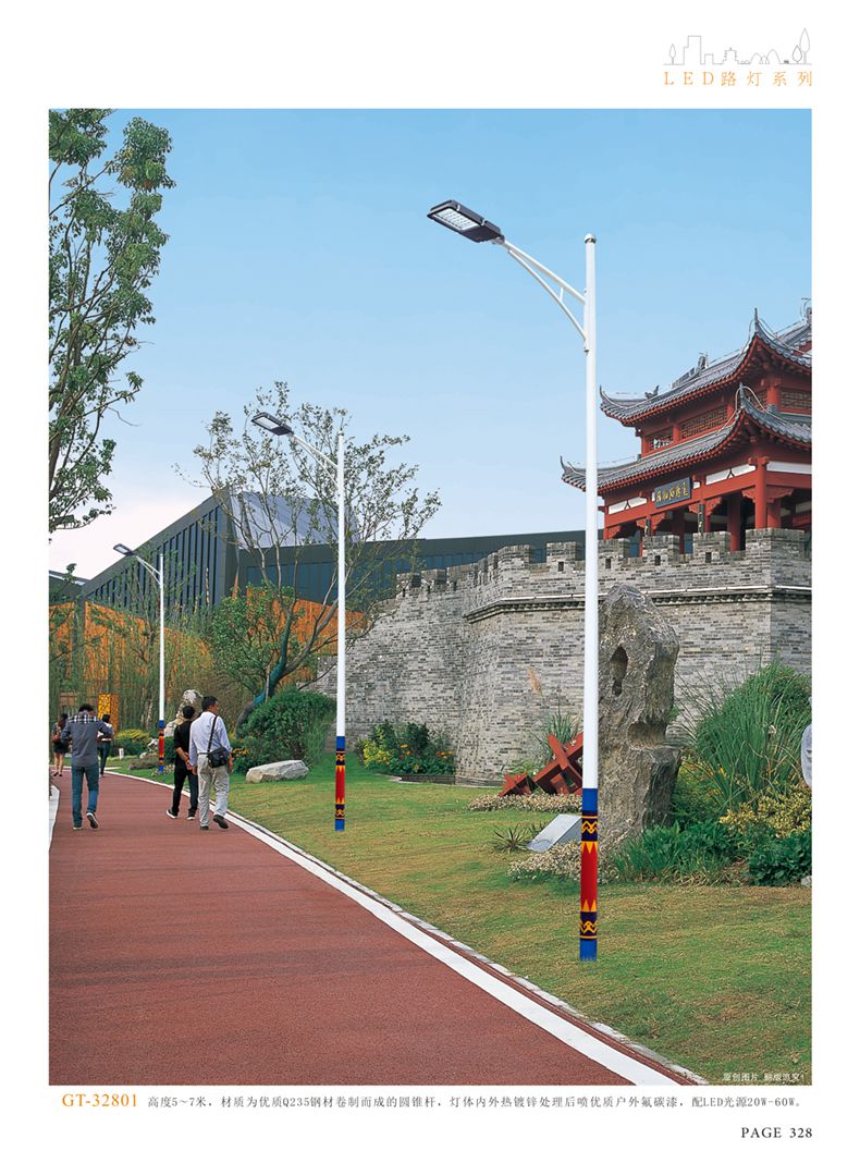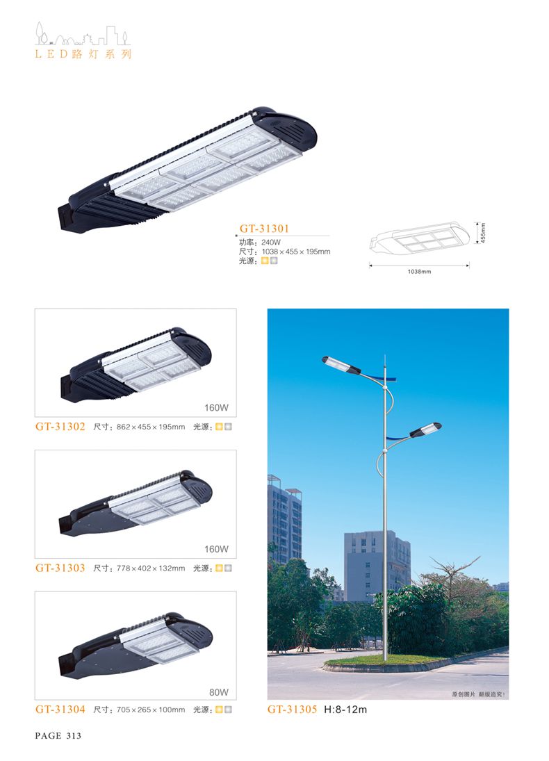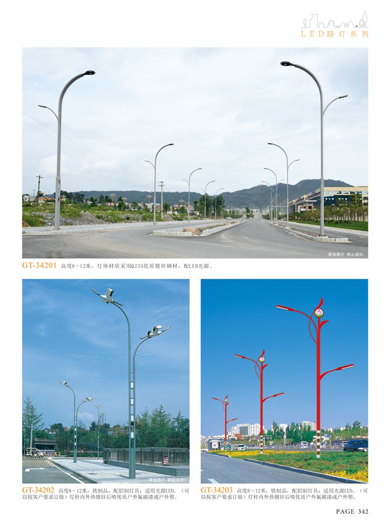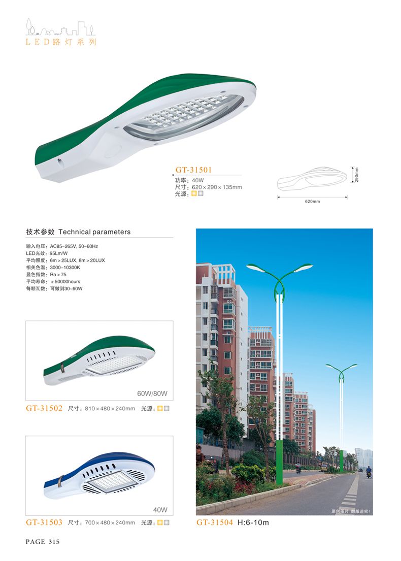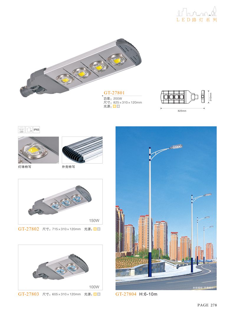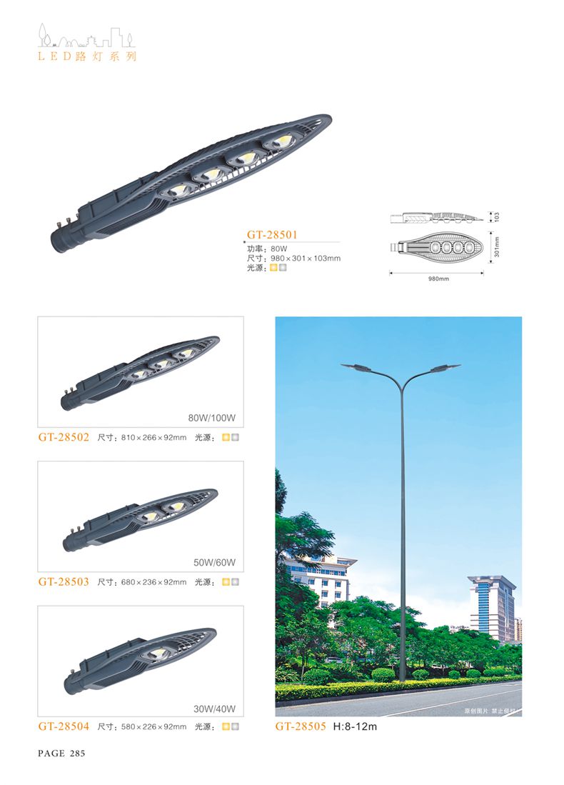 產(chǎn)品名稱:LED道路燈 配用光源:LED30-300W 高壓鈉燈150W、250W、400W 電源參數(shù):220V±10V/50Hz-60Hz 燈具燈頭:壓鑄鋁制品燈具,E40陶瓷燈頭 安裝高度:6米~12米 材料參數(shù):鐵制品內(nèi)外熱鍍鋅防腐處理,燈體表面噴優(yōu)質(zhì)戶外氟碳漆 產(chǎn)品特點(diǎn):設(shè)計美觀、簡潔大方、安裝方便 使用場所:高速公路、城市道路、廠區(qū)、別墅等場所