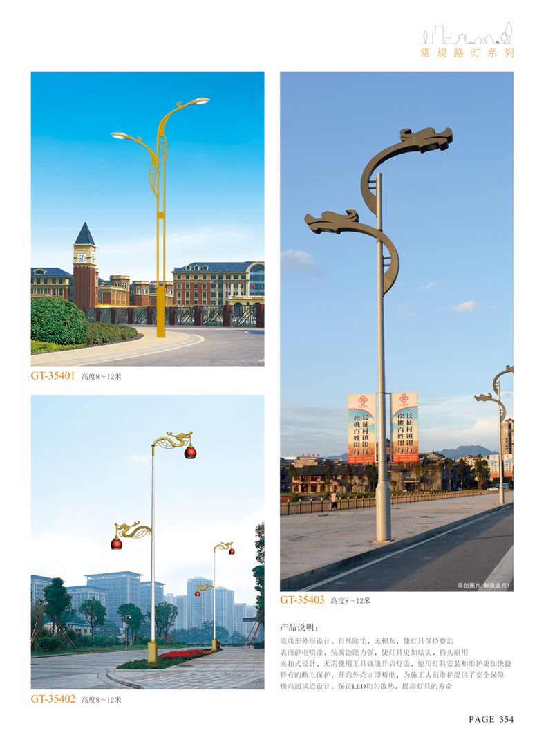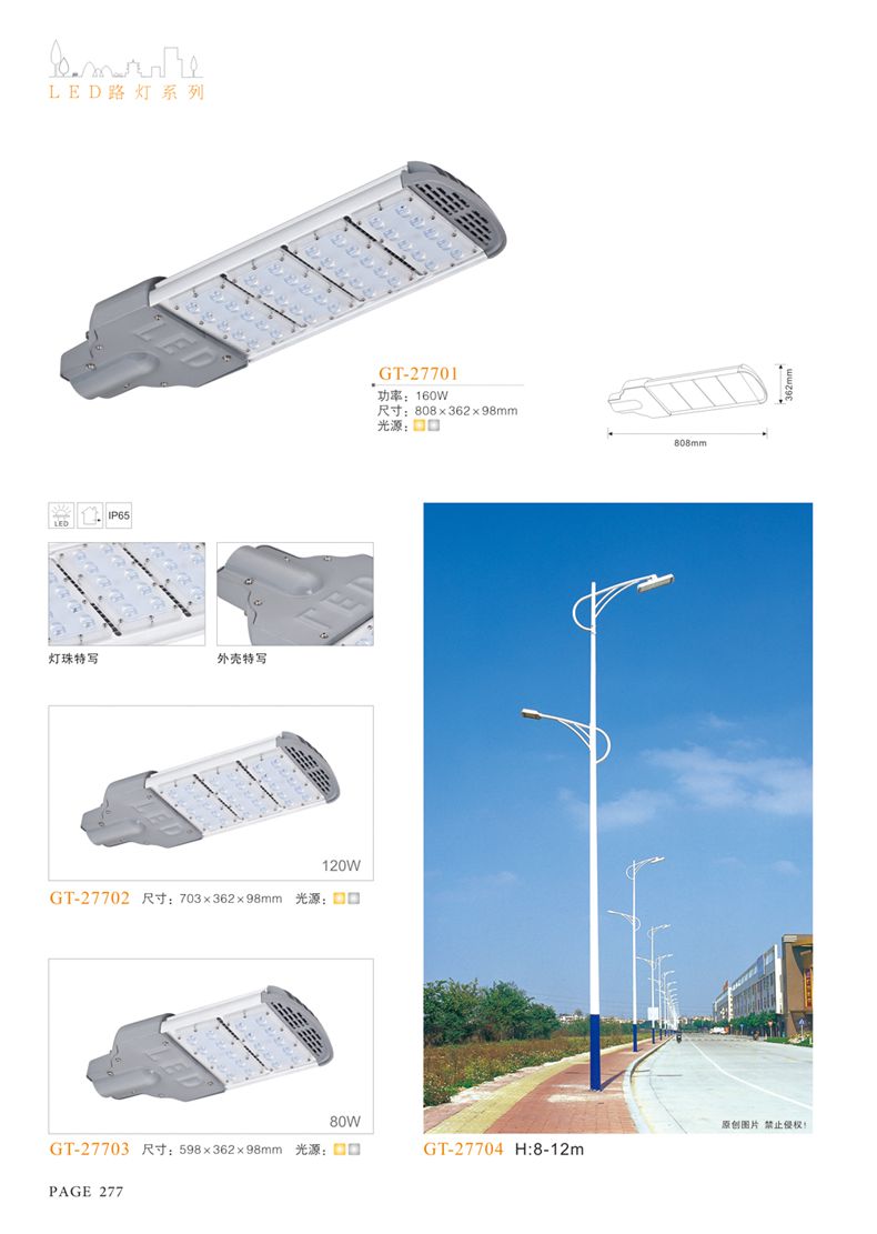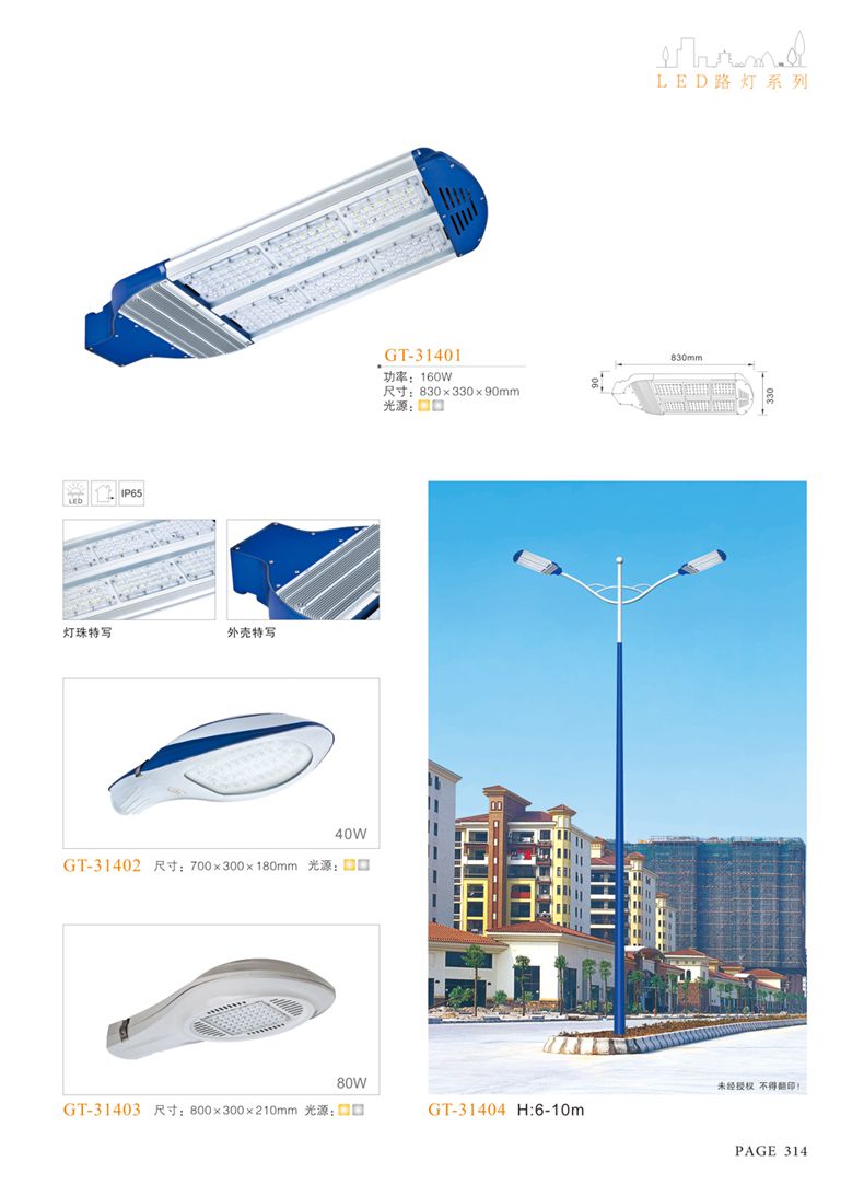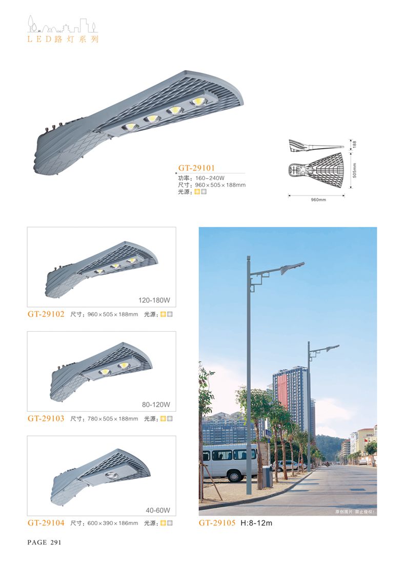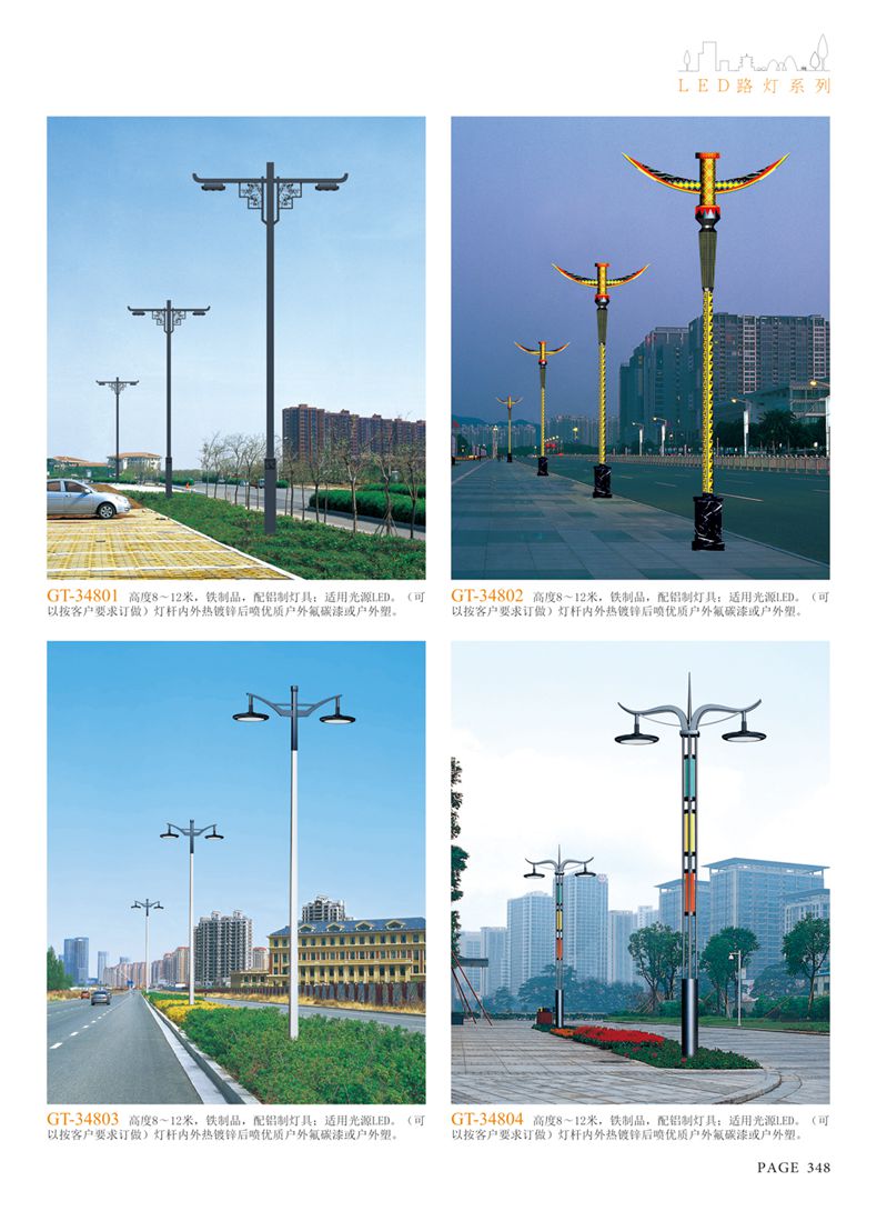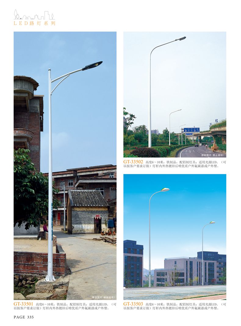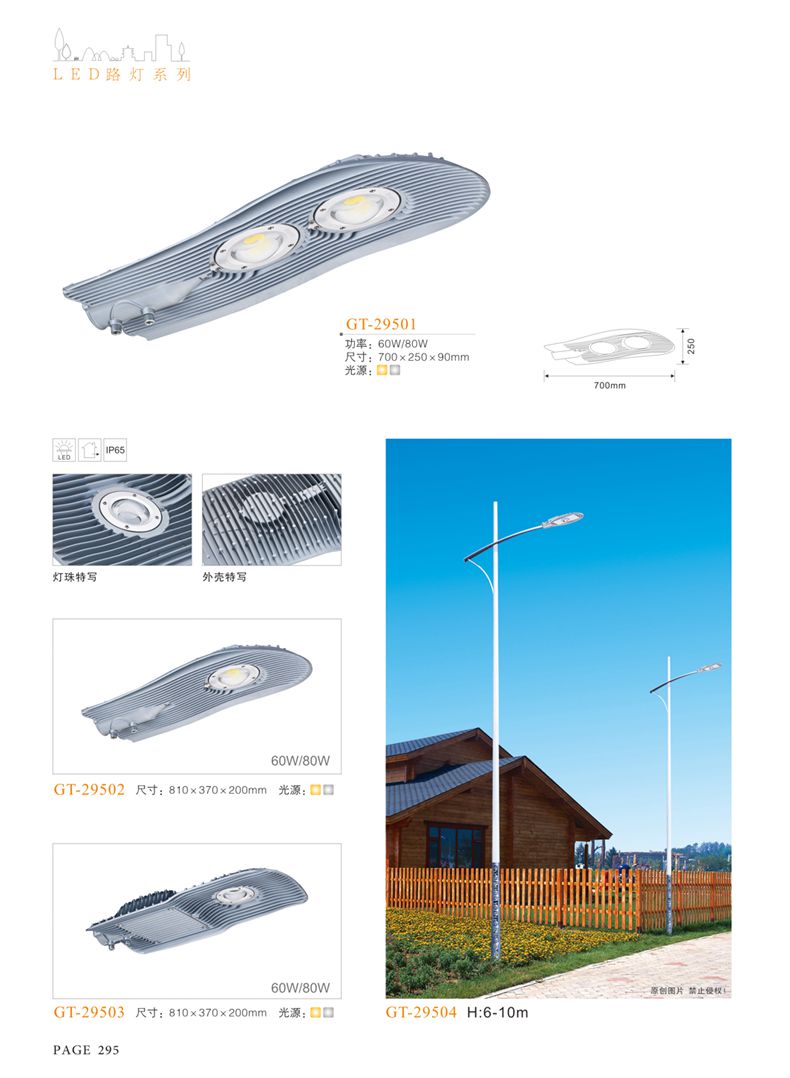 產(chǎn)品名稱:LED道路燈 配用光源:LED30-300W 高壓鈉燈150W、250W、400W 電源參數(shù):220V±10V/50Hz-60Hz 燈具燈頭:壓鑄鋁制品燈具,E40陶瓷燈頭 安裝高度:6米~12米 材料參數(shù):鐵制品內(nèi)外熱鍍鋅防腐處理,燈體表面噴優(yōu)質(zhì)戶外氟碳漆 產(chǎn)品特點(diǎn):設(shè)計美觀、簡潔大方、安裝方便 使用場所:高速公路、城市道路、廠區(qū)、別墅等場所